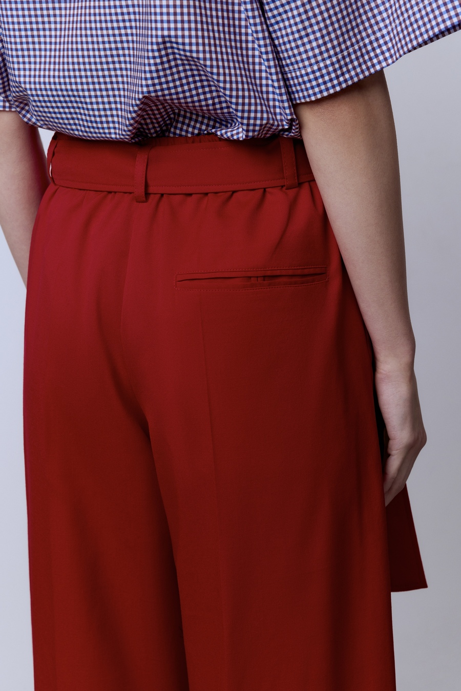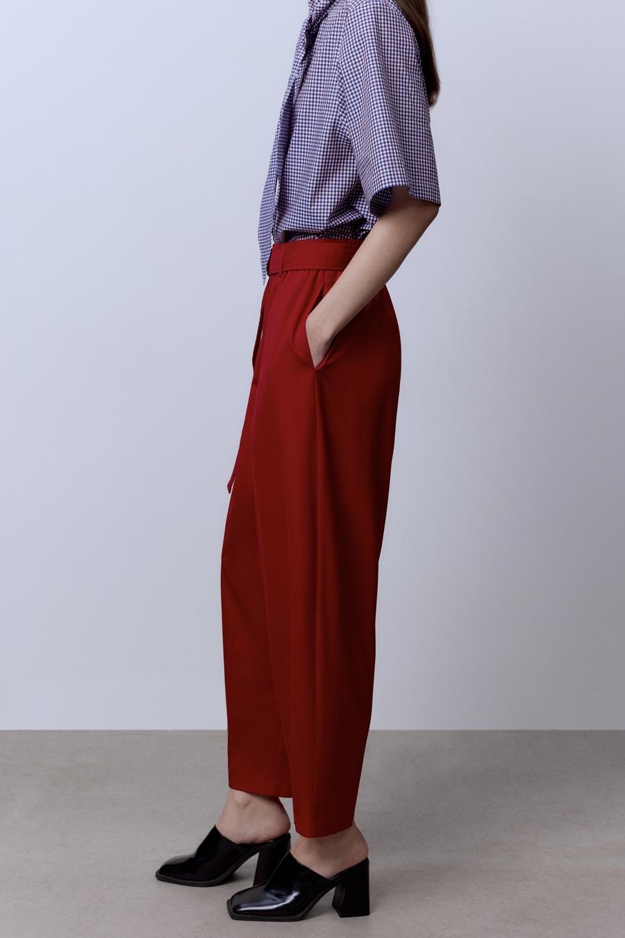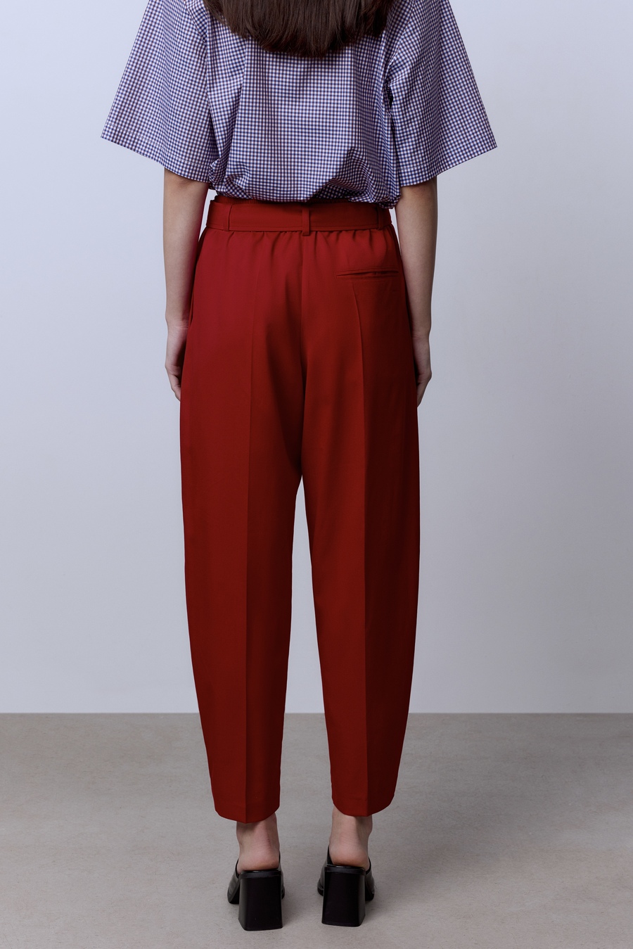 Красный оттенок — не просто цвет, а манифест уверенности. Лёгкая, дышащая ткань из итальянской шерсти Lana Super 120 подчёркивает изящество силуэта и дарит комфорт в любое время дня. Идеальная посадка превращает эти брюки в универсальный инструмент стиля: с белой рубашкой — для деловых встреч, с трикотажем — для непринуждённых выходов, с каблуками — для вечера, где вы будете центром притяжения.