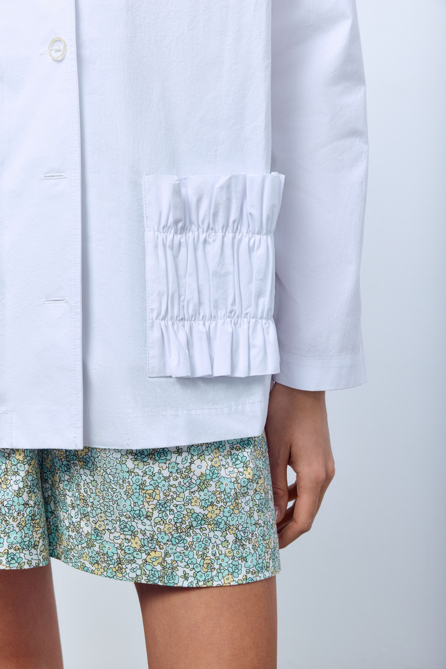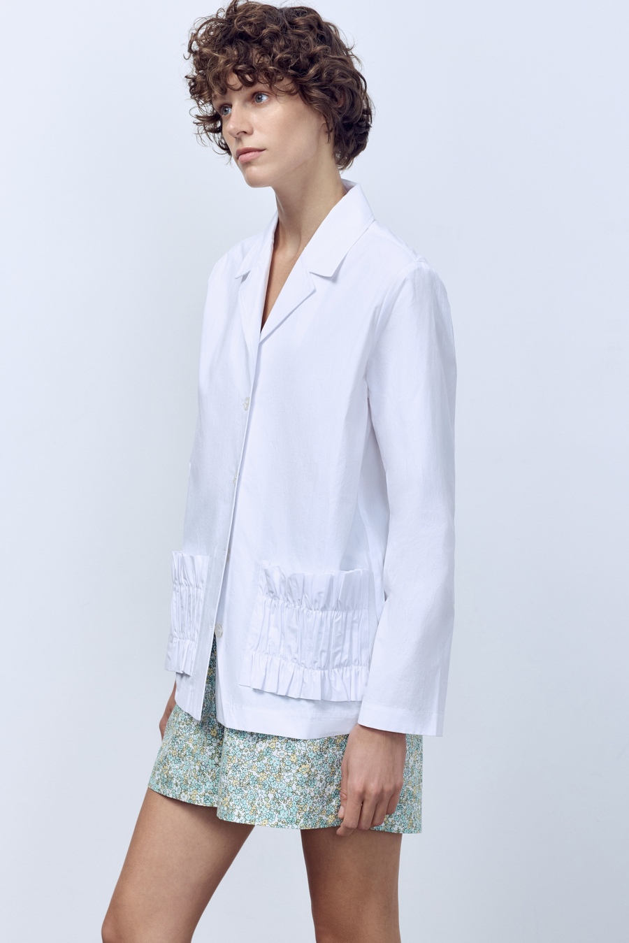 Лёгкий жакет-рубашка с рюшами станет вашим летним фаворитом. Мы сшили его из итальянского варёного хлопка. Плотный, но при этом лёгкий материал не просвечивает и обеспечивает комфорт во время носки. Сочетайте модель с топом и носите её нараспашку или надевайте на голое тело, застегнув на пуговицы.