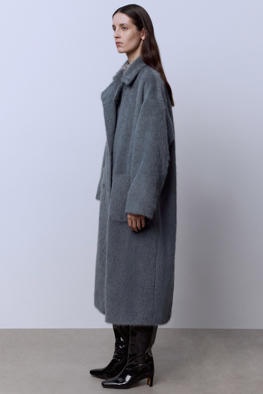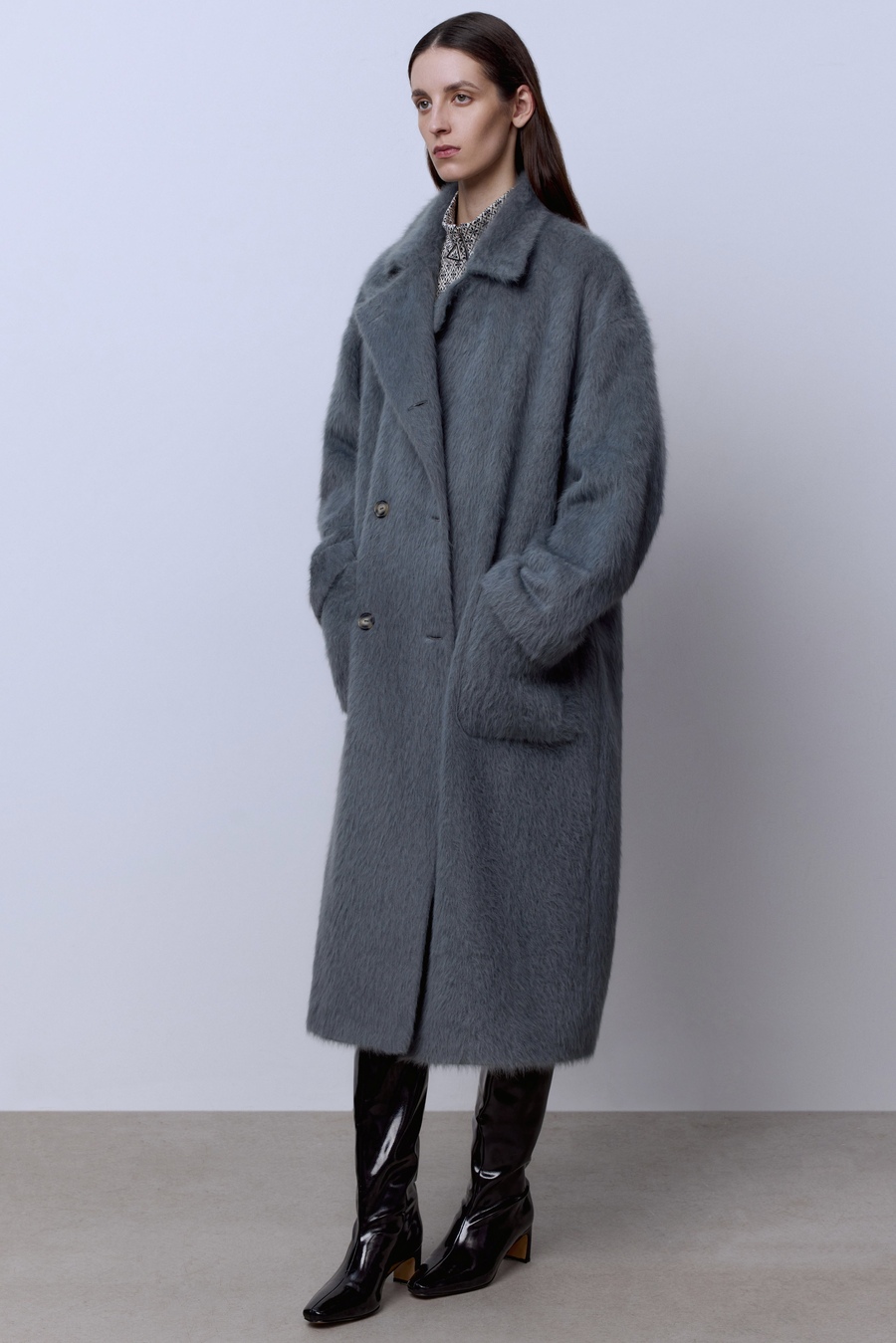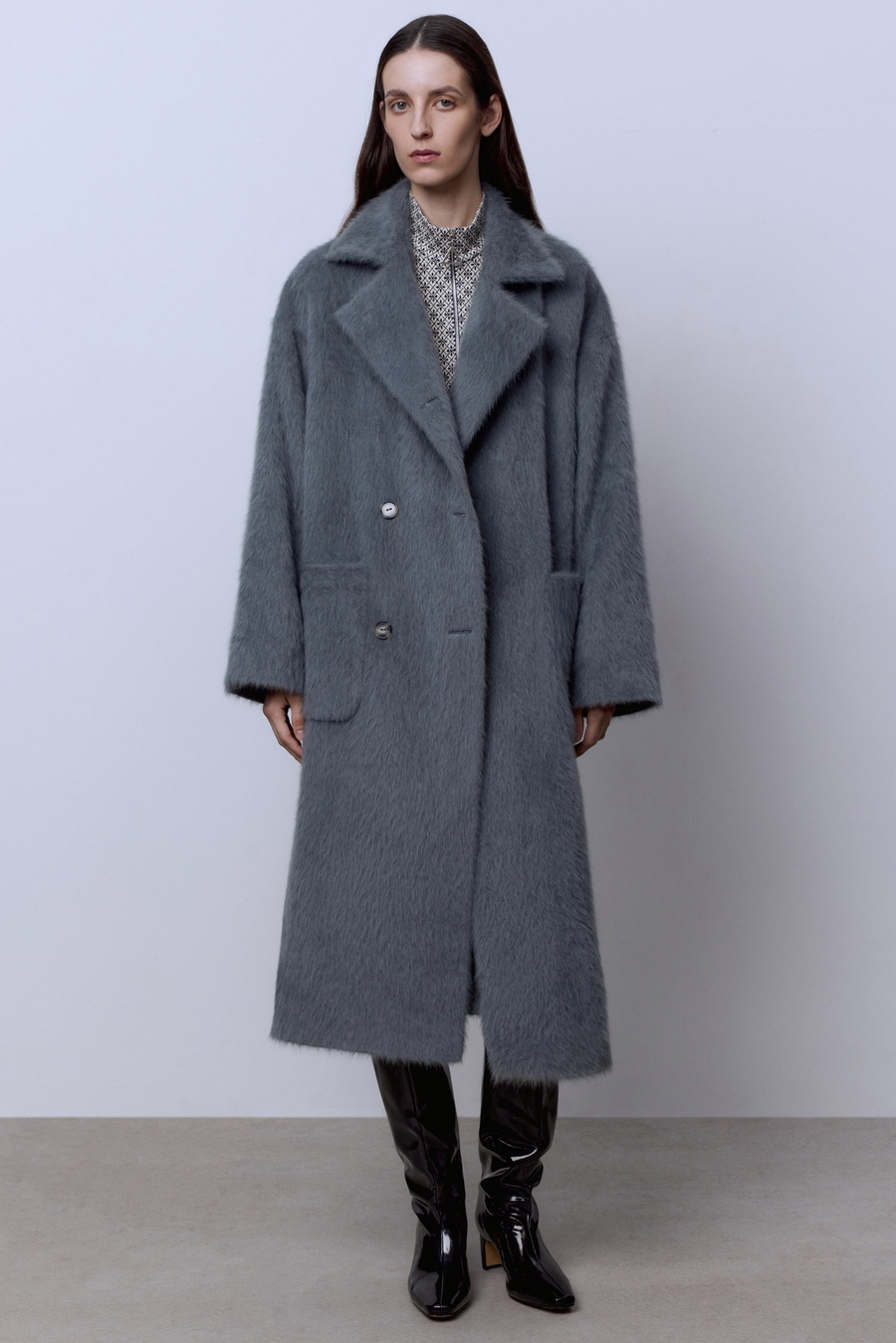 Пальто макси из шерсти в клетку, серый