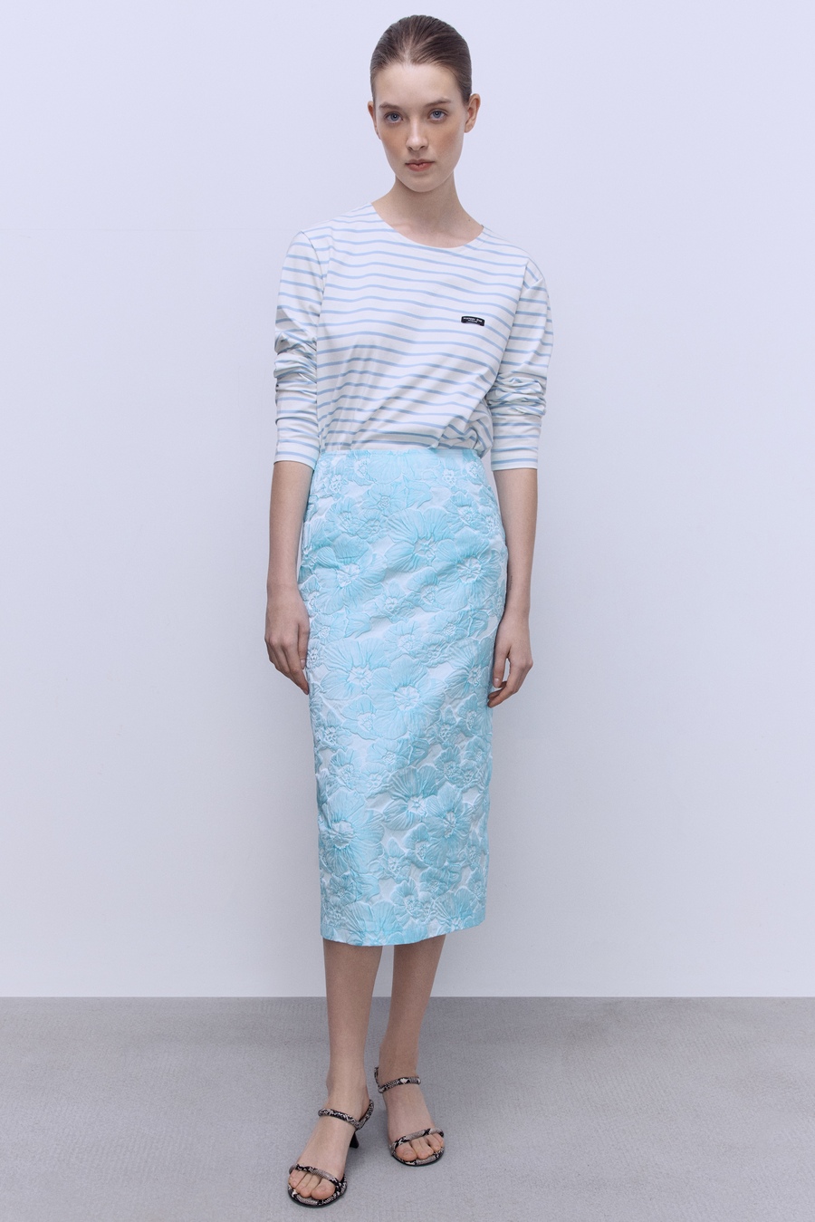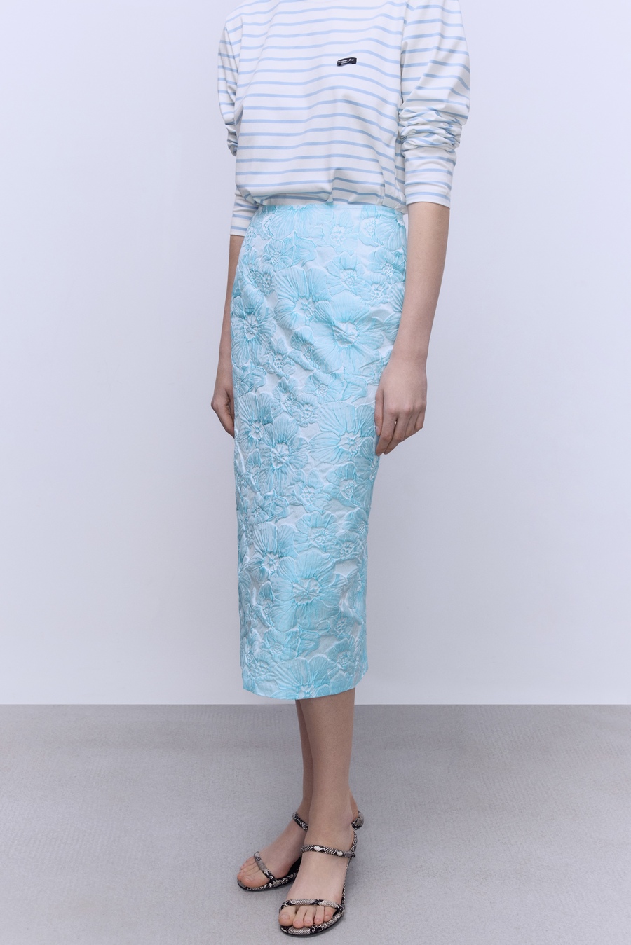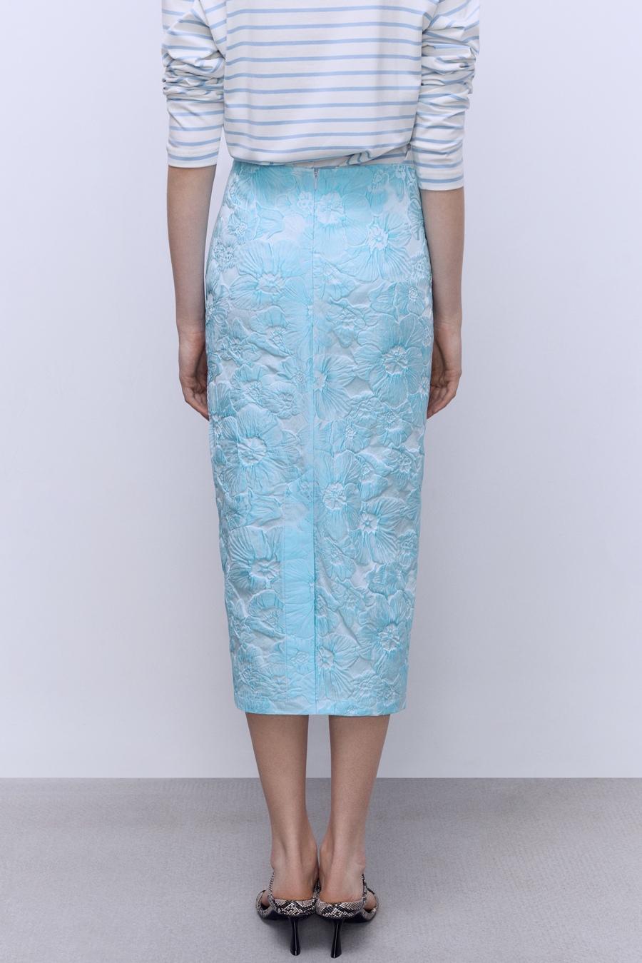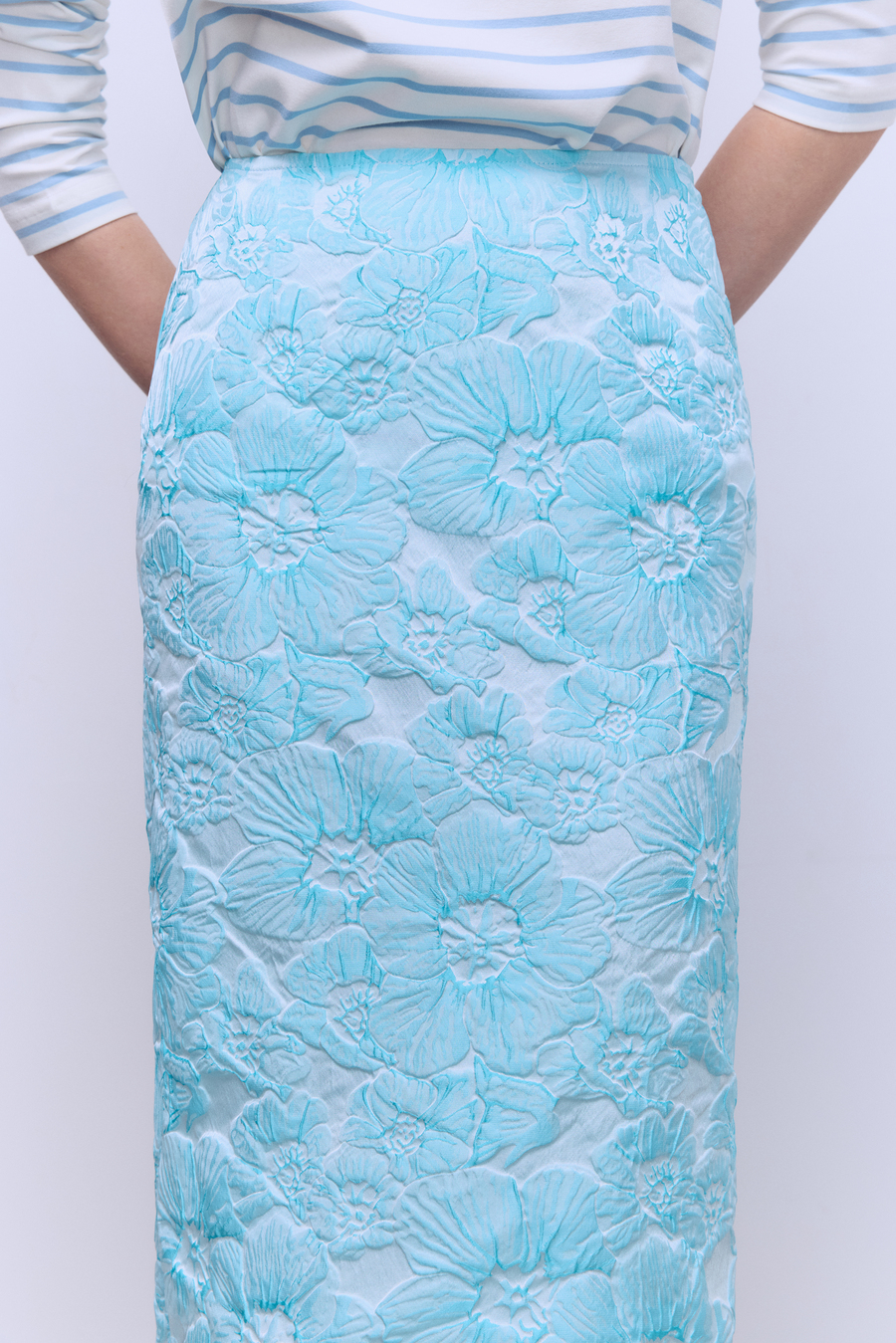 Эта юбка-тубина из благородного жаккарда с рельефными цветами в небесно-голубом оттенке идеально подчеркивает силуэт, а накладная баска добавляет выразительности и легкости образу. Носите с кроп-топом и лодочками для эффектного вечернего выхода или сочетайте с базовой рубашкой и массивными украшениями для стильного офисного ансамбля. Лаконичный крой, премиальные ткани и безупречная посадка.