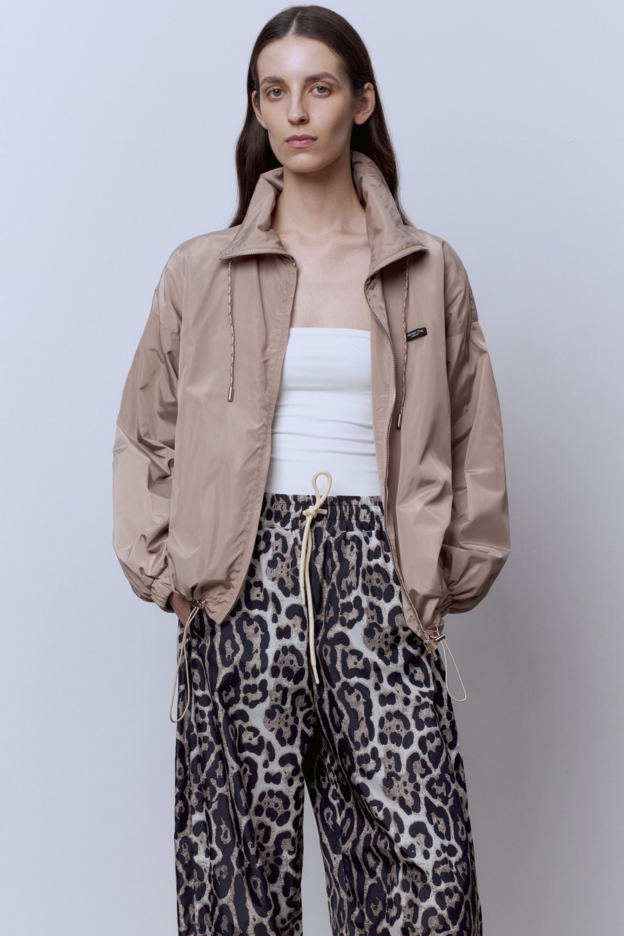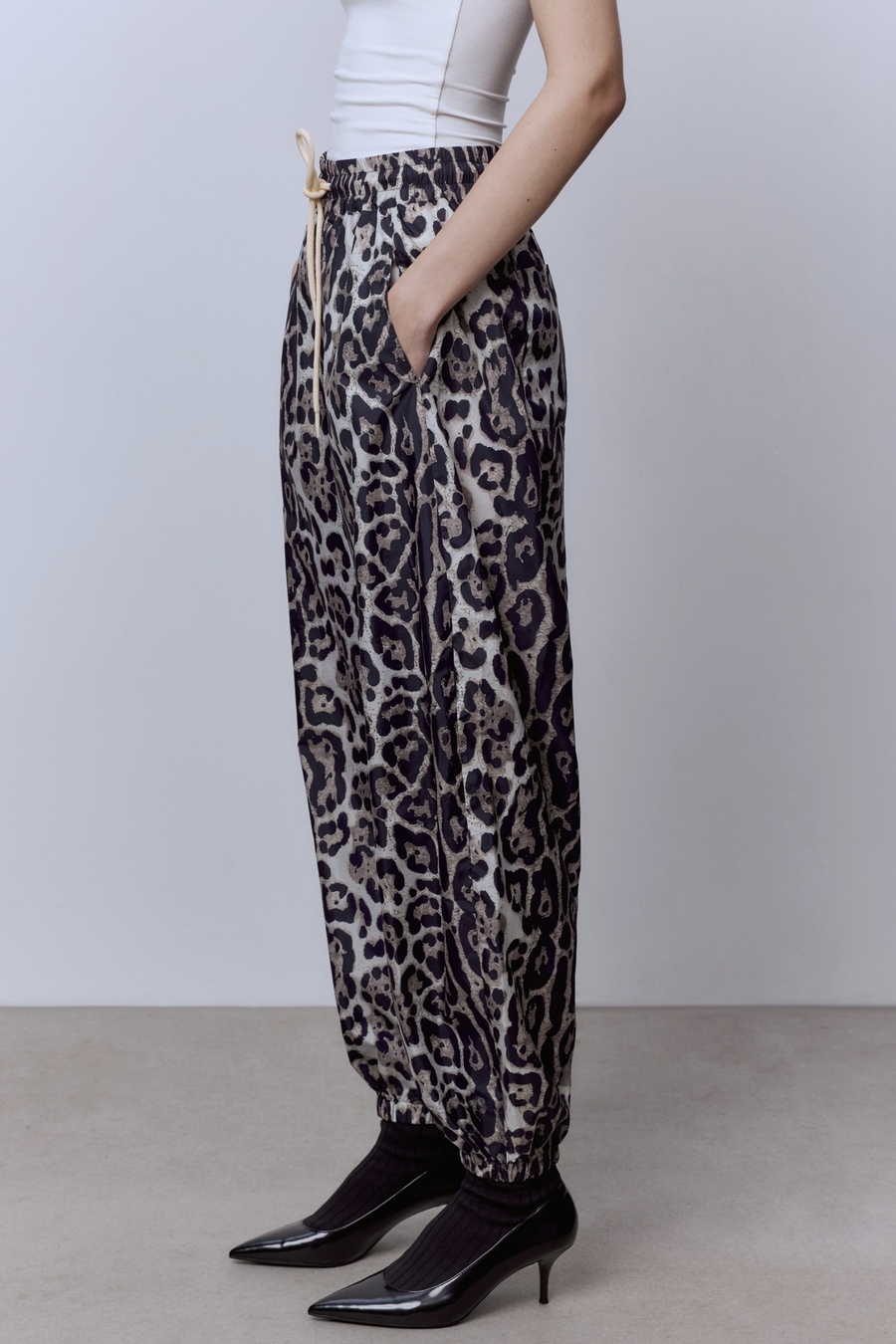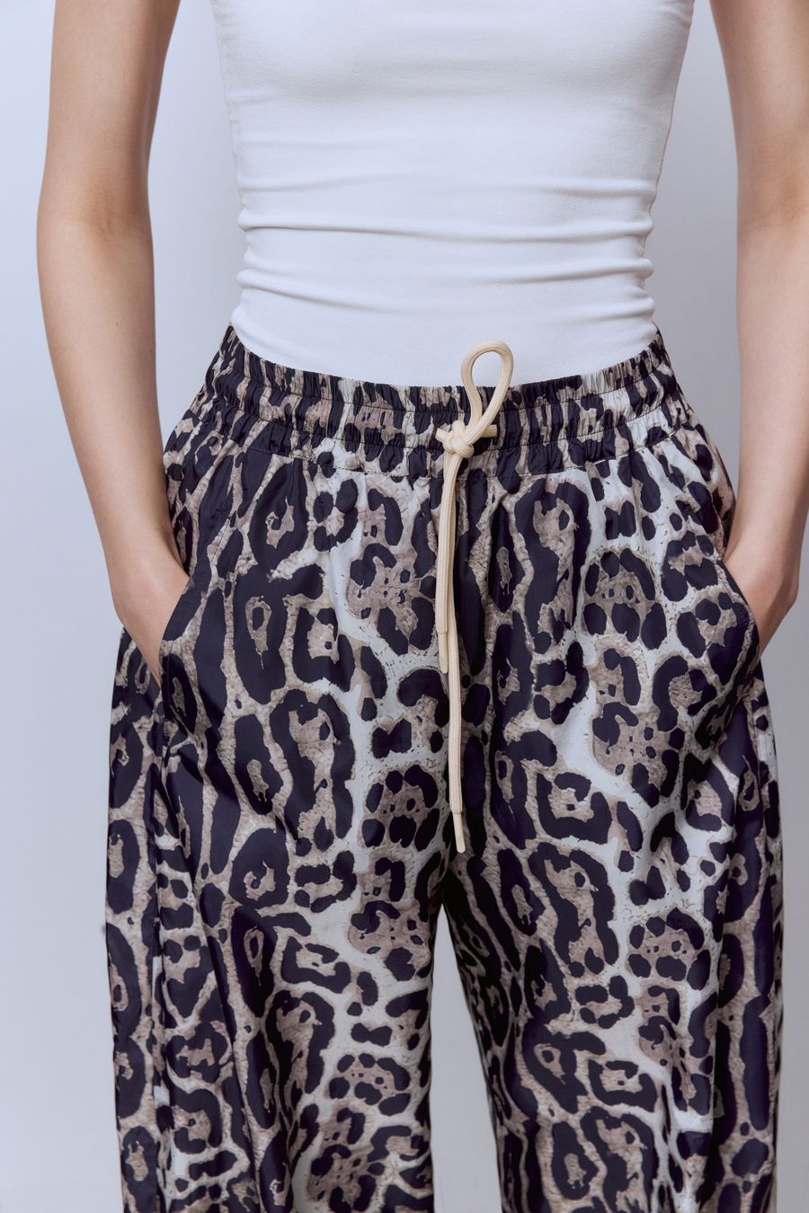 Леопардовые брюки из нейлона — это вызов в самом стильном прочтении. Лёгкая ткань держит форму и дарит комфорт, а дерзкий принт превращает привычный образ в смелое высказывание. Их легко носить днём с футболкой и кроссовками или вечером — с топом и каблуками. Такая вещь не просится в гардероб, она требует внимания и задаёт настроение.