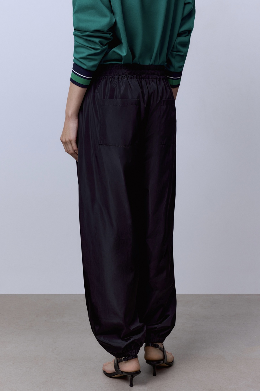 Минимализм с характером. Эти брюки из гладкого нейлона на мягкой подкладке созданы для динамичных дней и смелых образов. Лаконичный чёрный оттенок задаёт универсальность, а фактура ткани добавляет современный ритм в каждый шаг.