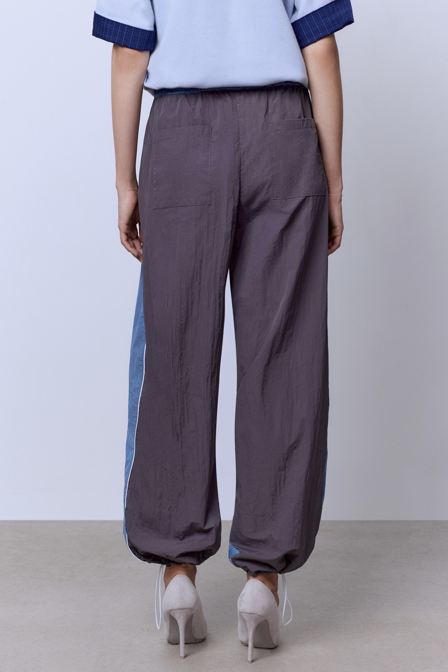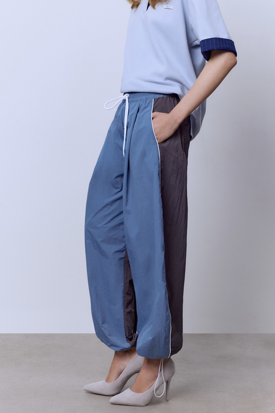 Брюки, которые сами задают ритм. Лаконичный крой и дерзкая игра двух оттенков превращают привычный нейлон в модное высказывание. Контрастный кант чётко очерчивает силуэт, добавляя спортивной динамики в каждый шаг. Эти брюки легко вписываются и в расслабленный дневной образ с кроссовками, и в вечерний — с каблуками и яркой помадой.