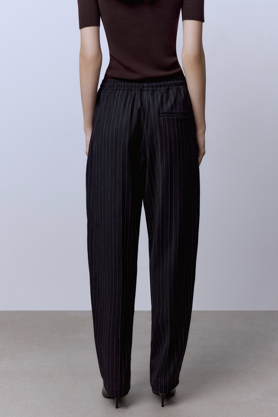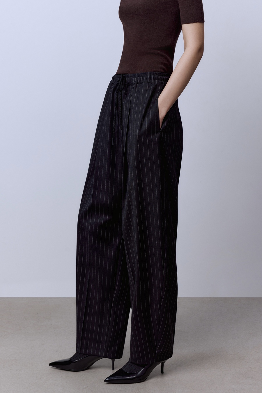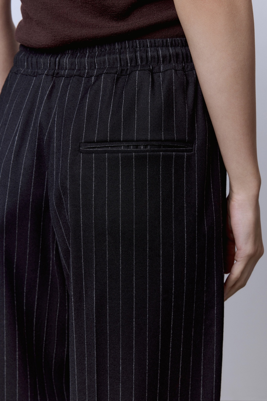 Брюки из шерстяной фланели в полоску — это современная интерпретация классики, где строгая линия встречается с мягкой фактурой. Лёгкая шерсть комфортно согревает и красиво драпируется, а деликатный рисунок в полоску визуально вытягивает силуэт, добавляя образу лёгкости и динамики.