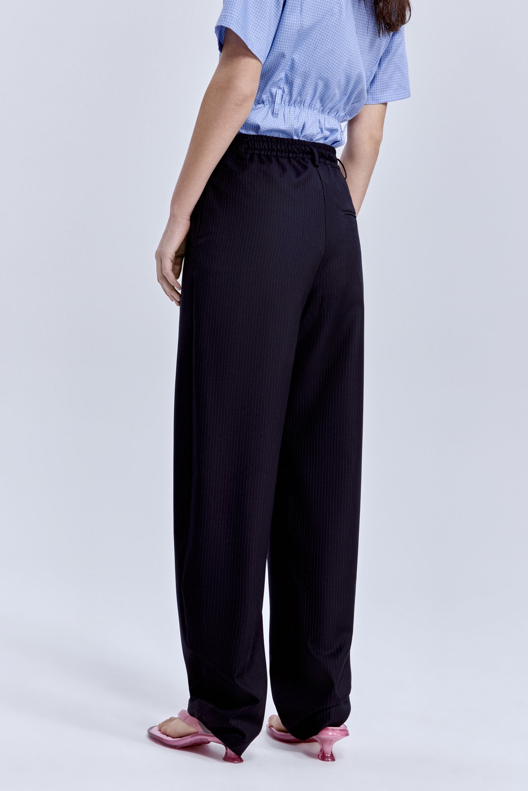 Сине-графитовый оттенок и тонкая вертикальная полоска визуально вытягивают силуэт, а мягкая шерсть держит форму и дарит комфорт. Легкие складки добавляют динамики и подчеркивают безупречный крой. Эти брюки легко впишутся и в офисный дресс-код, и в расслабленный вечерний образ с кроссовками или лодочками.