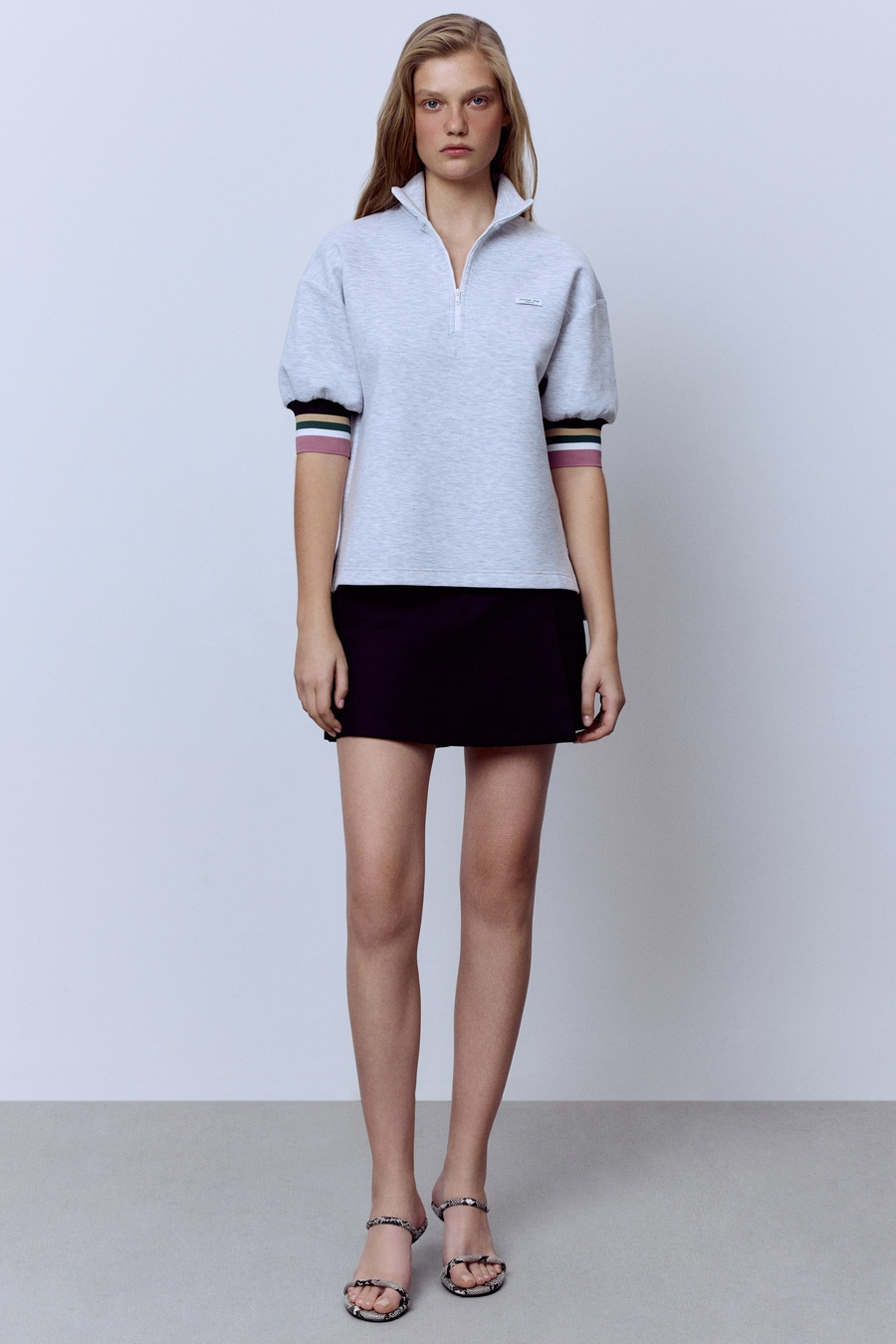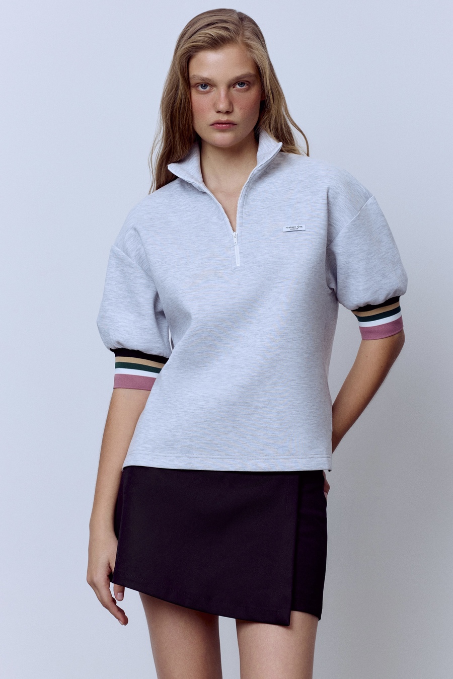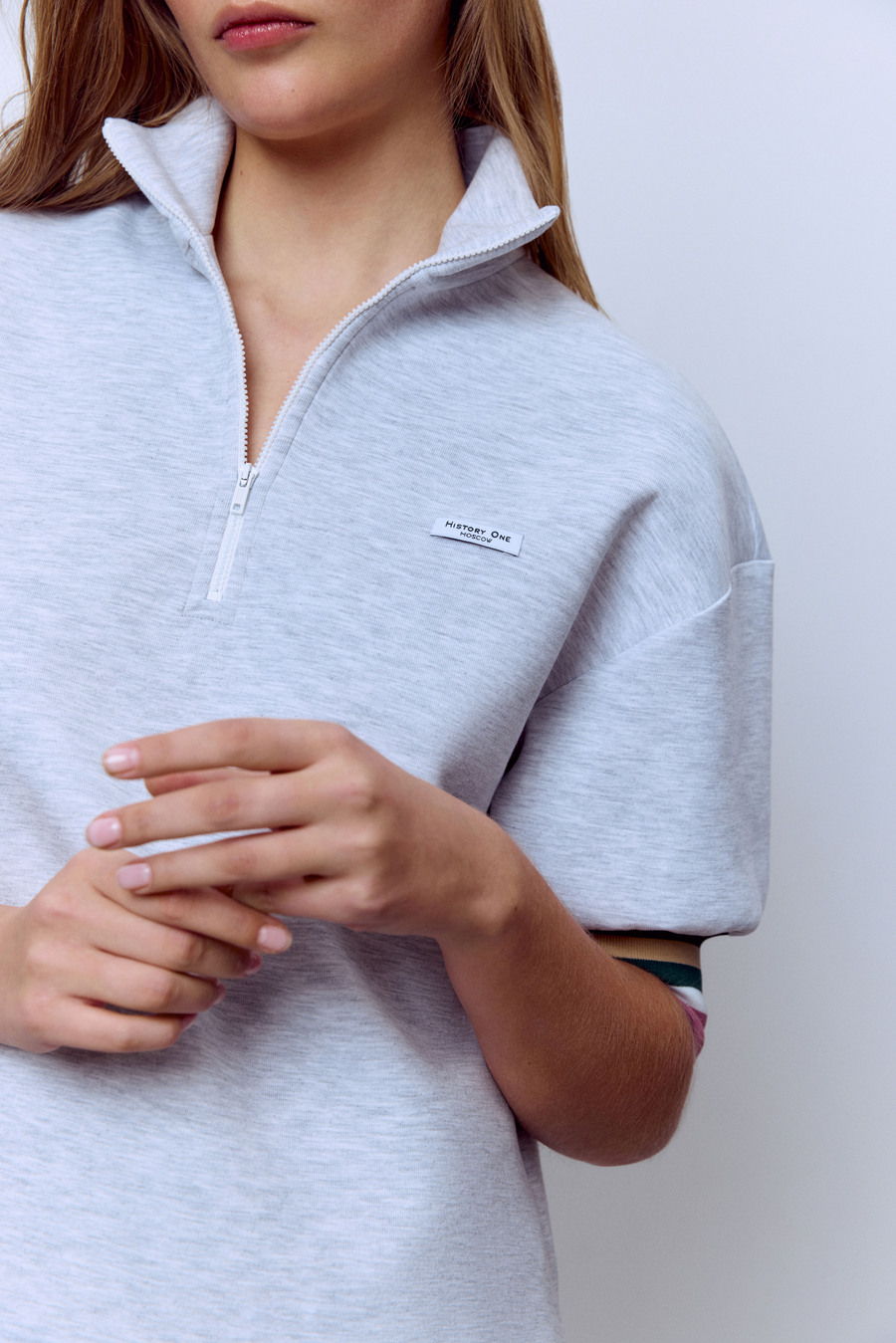 Поло на молнии с контрастными манжетами, серый меланж