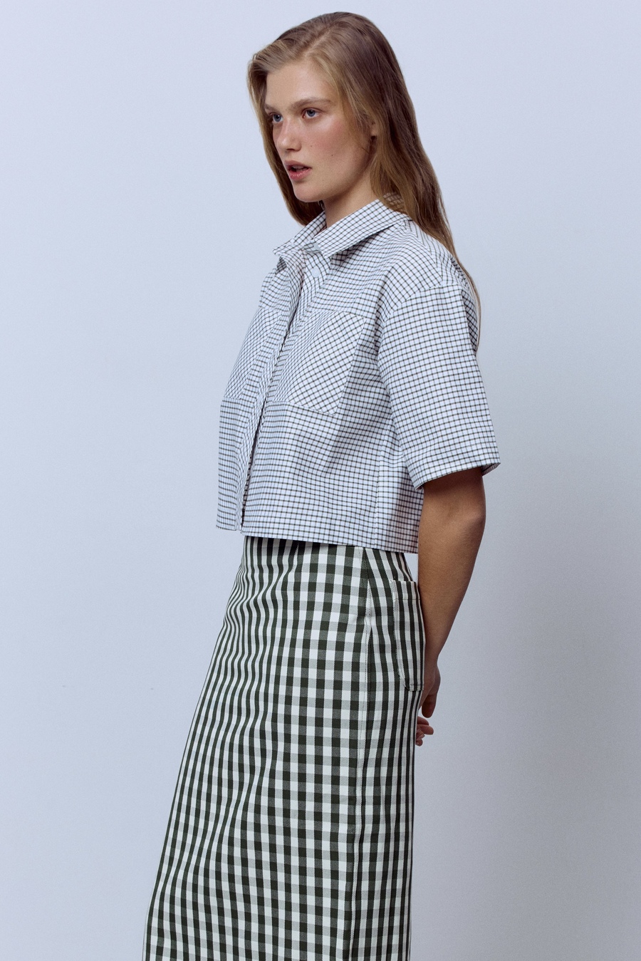 Рубашка-кроп в клетку, белый/зелёный