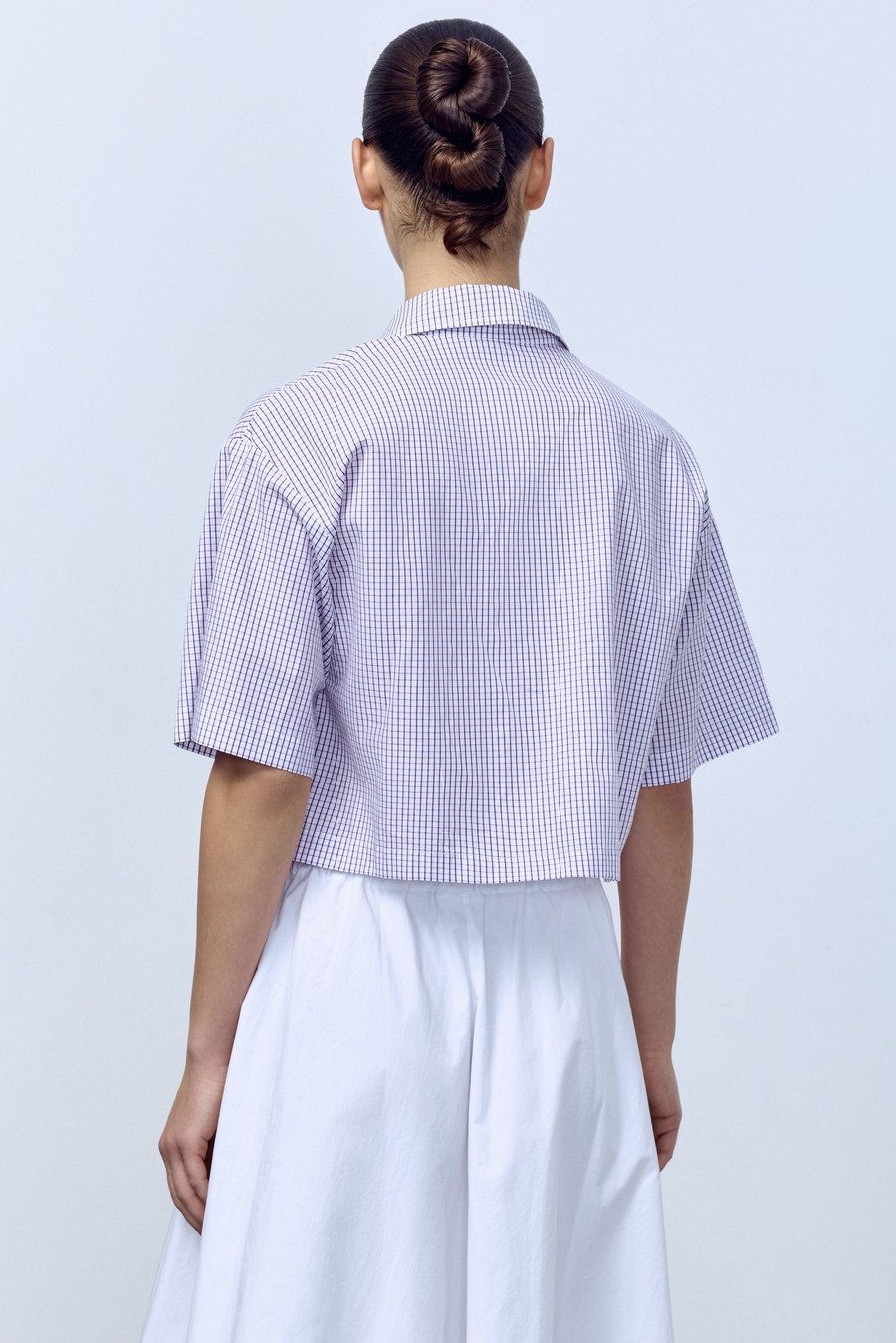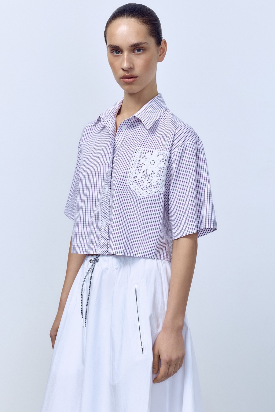 Рубашка-кроп в клетку с кружевным карманом, фиолетовый
