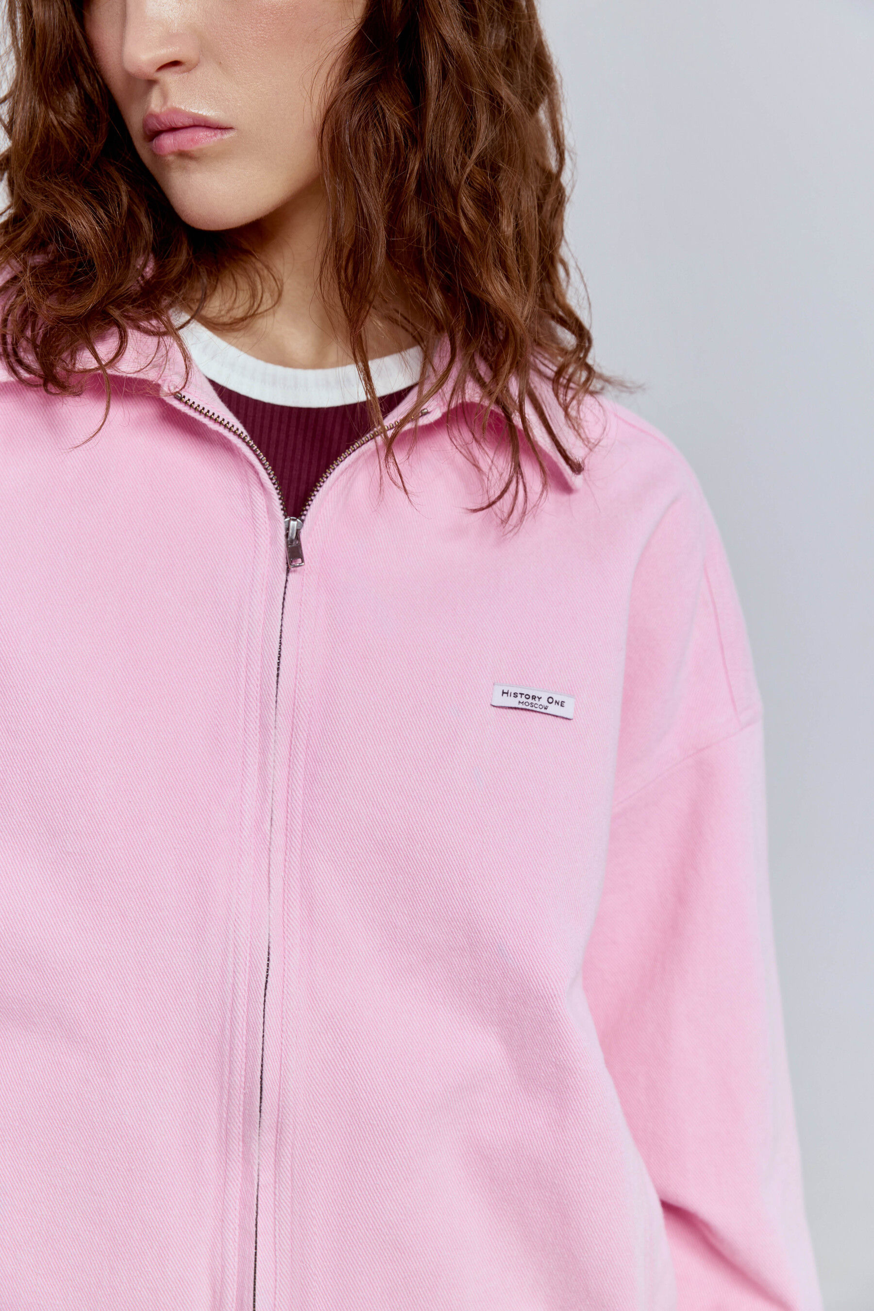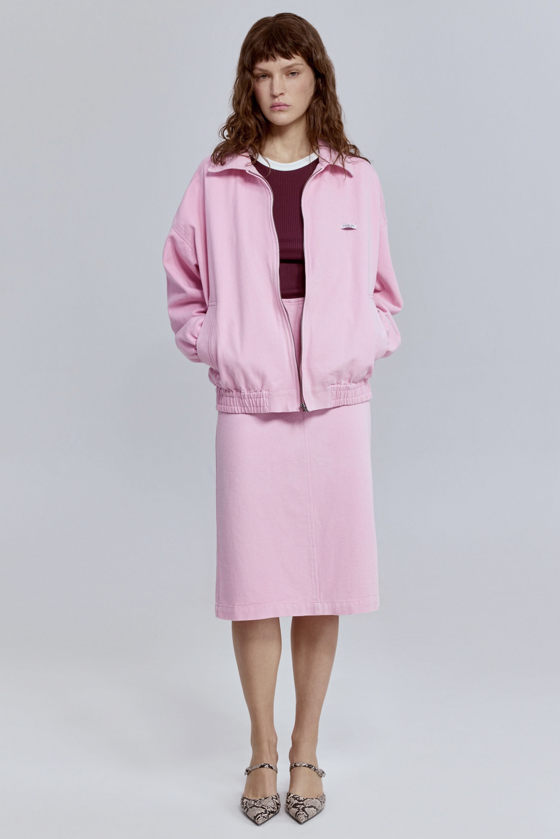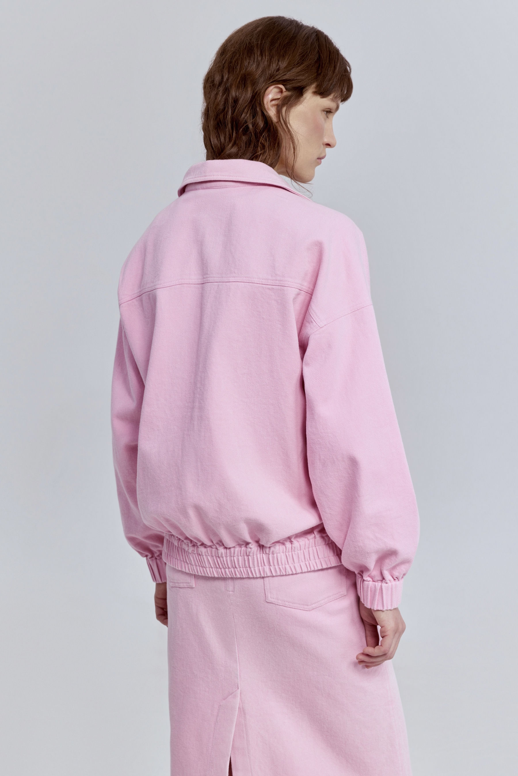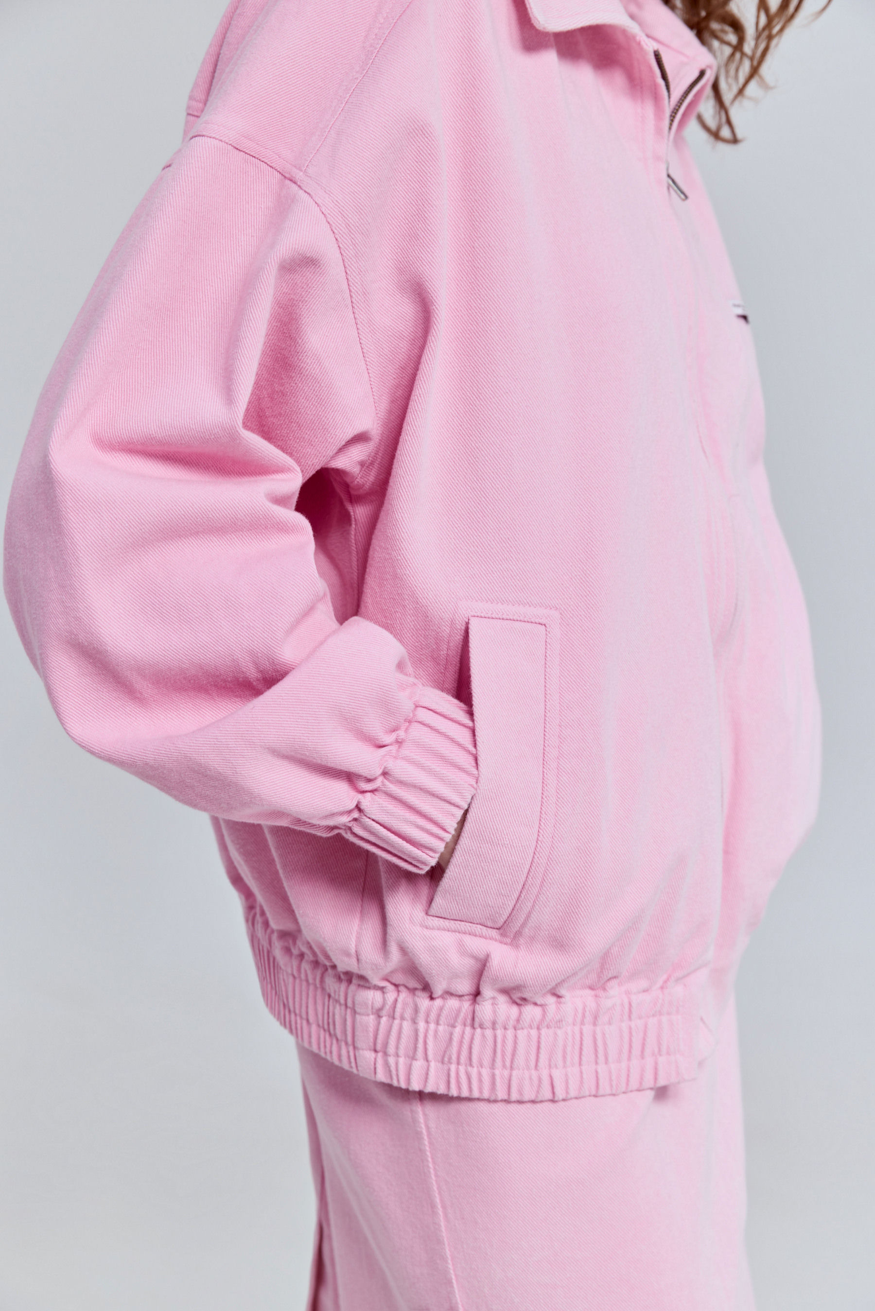 Бомбер, который забирает внимание без лишних слов. Варёный деним в розовом — это про контраст: мягкий цвет, жёсткий характер.