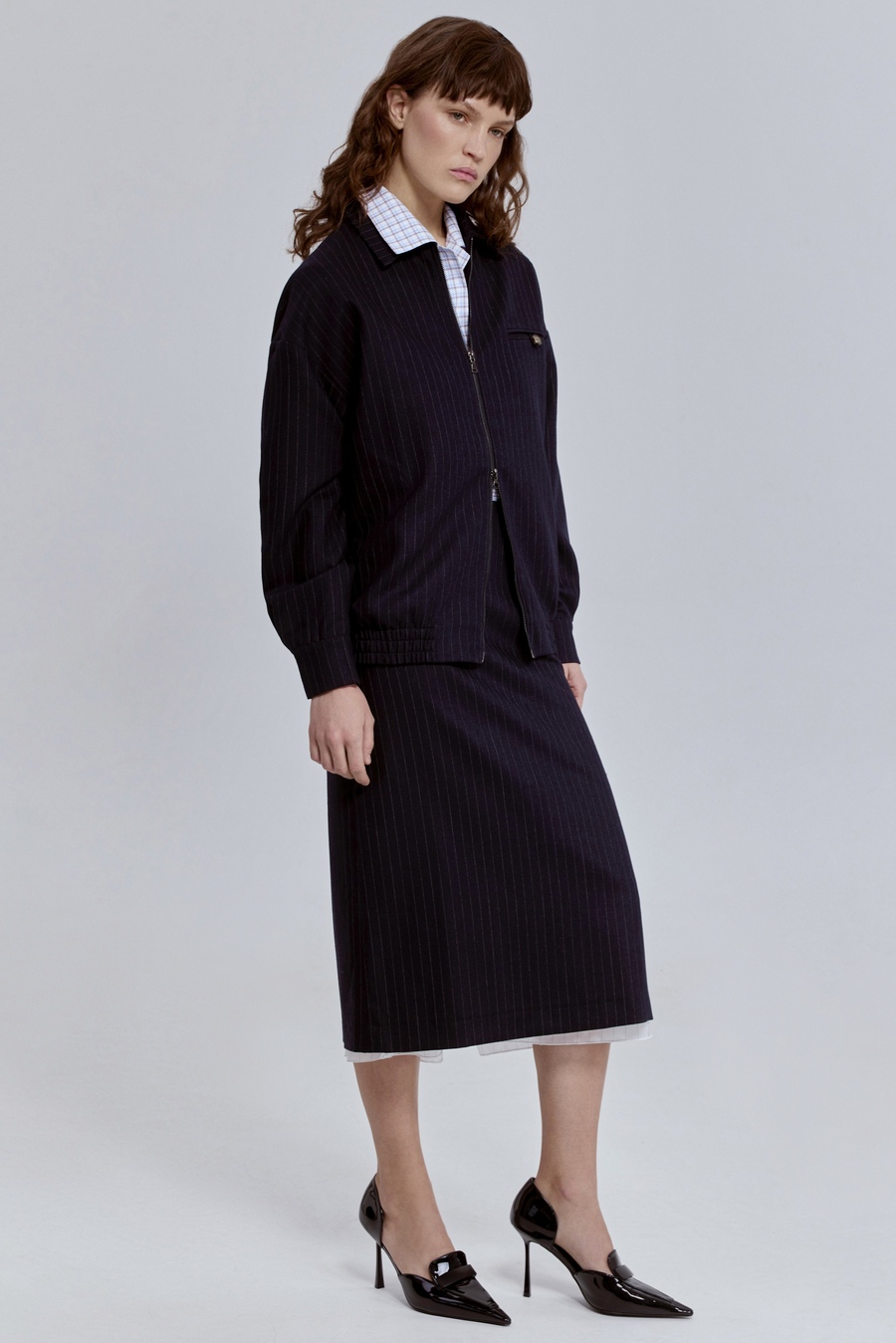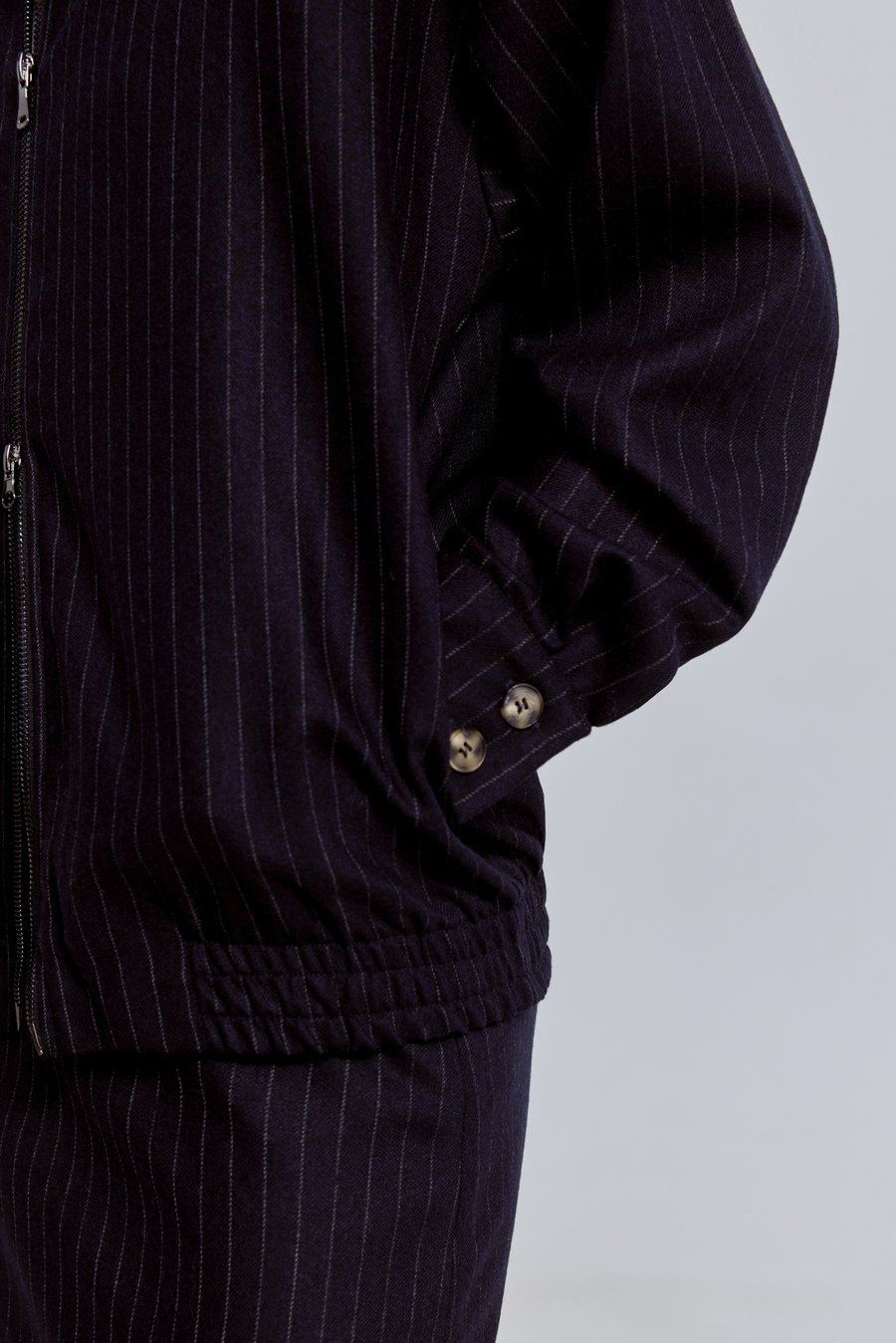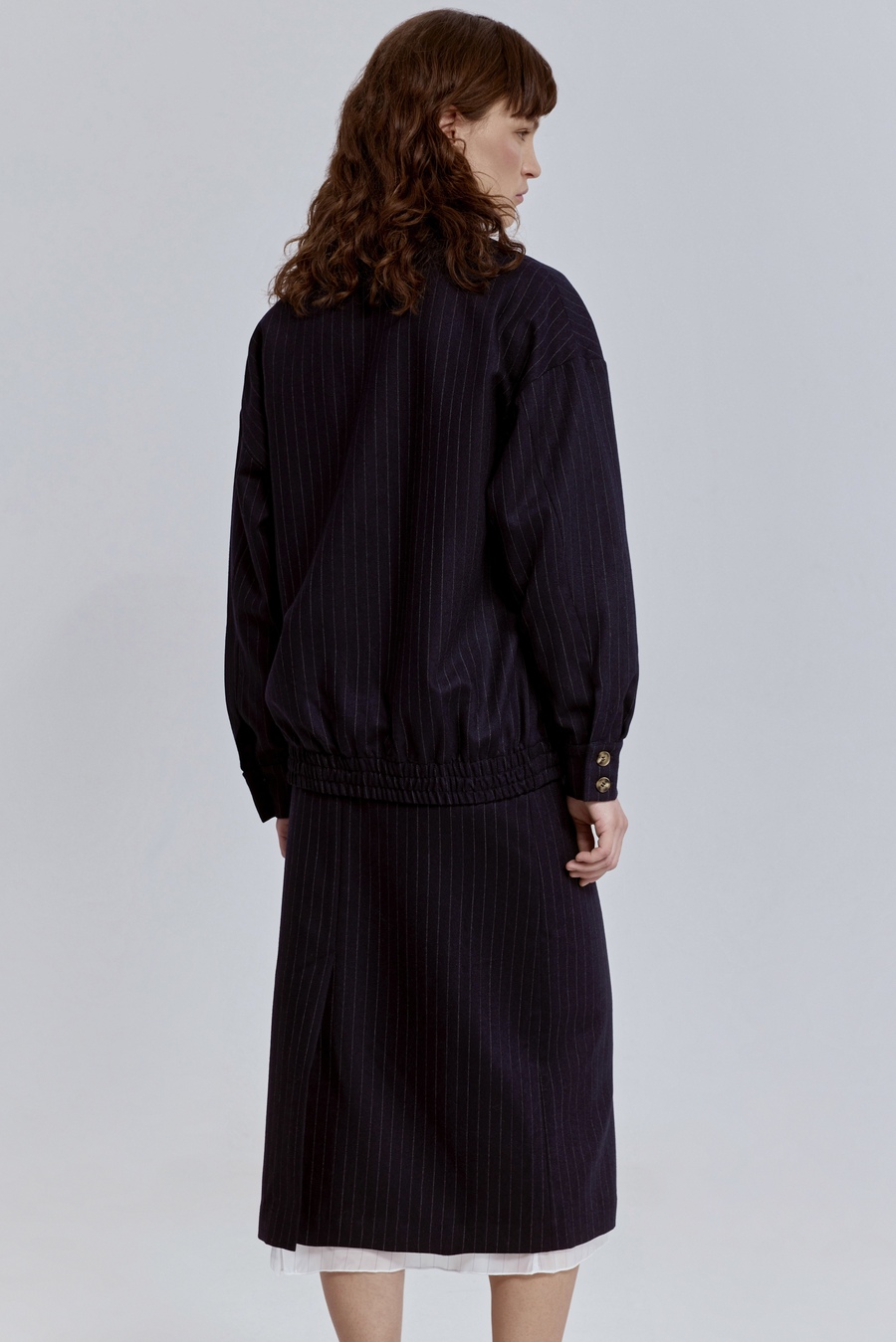 Он словно сошёл с подиума и сразу вписался в повседневный ритм. Классическая тёмно-синяя палитра и тонкая вертикальная полоска визуально вытягивают силуэт, придавая образу уверенность и точность. Структура костюмной шерсти делает модель благородной, а свободный крой — расслабленной и современной.