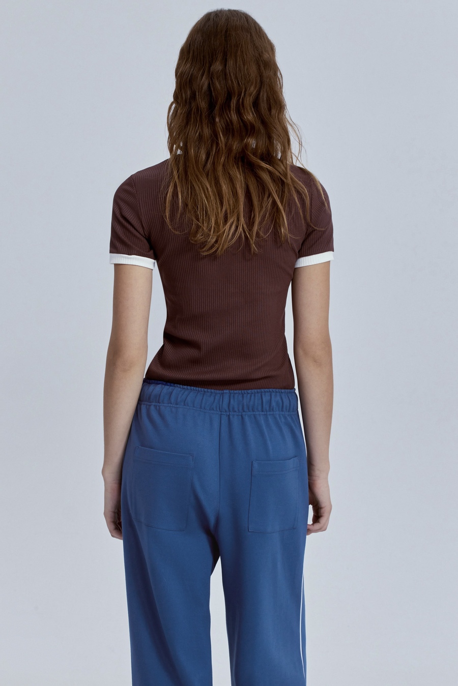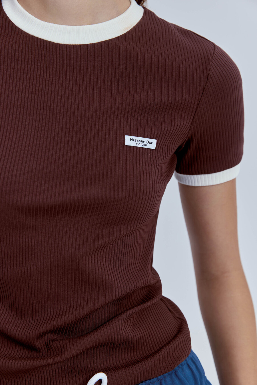 Футболка из хлопковой рибаны с контрастной отделкой, шоколад