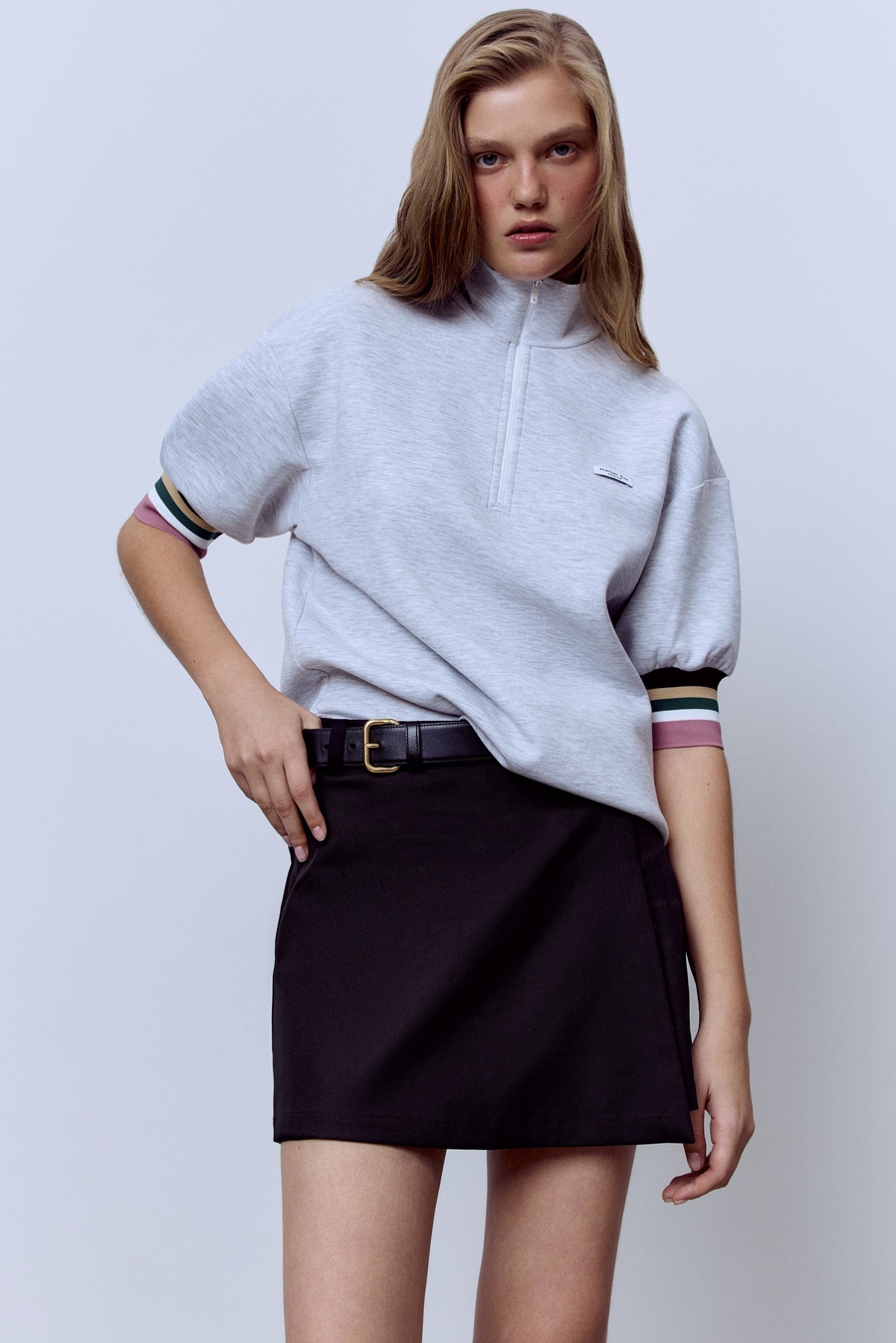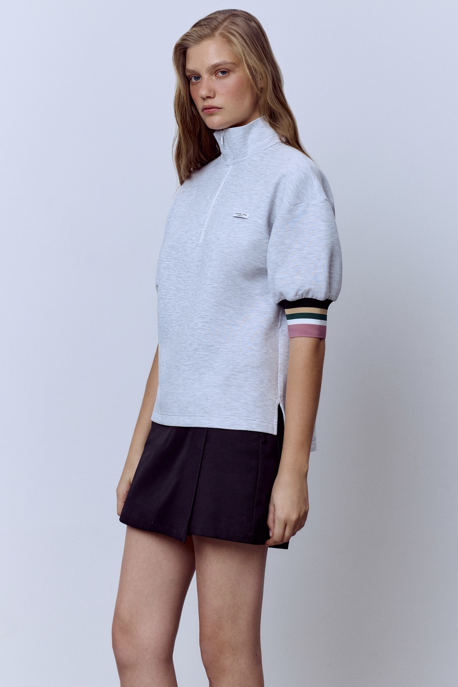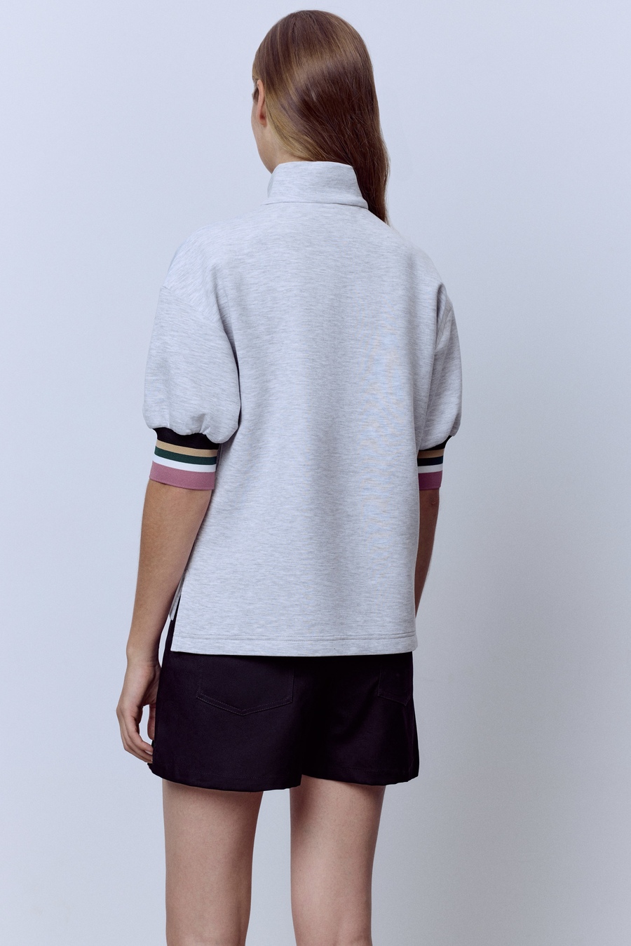 Поло на молнии с контрастными манжетами, серый меланж