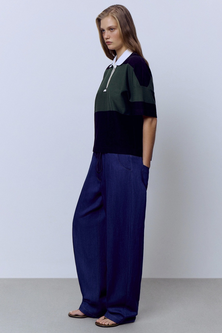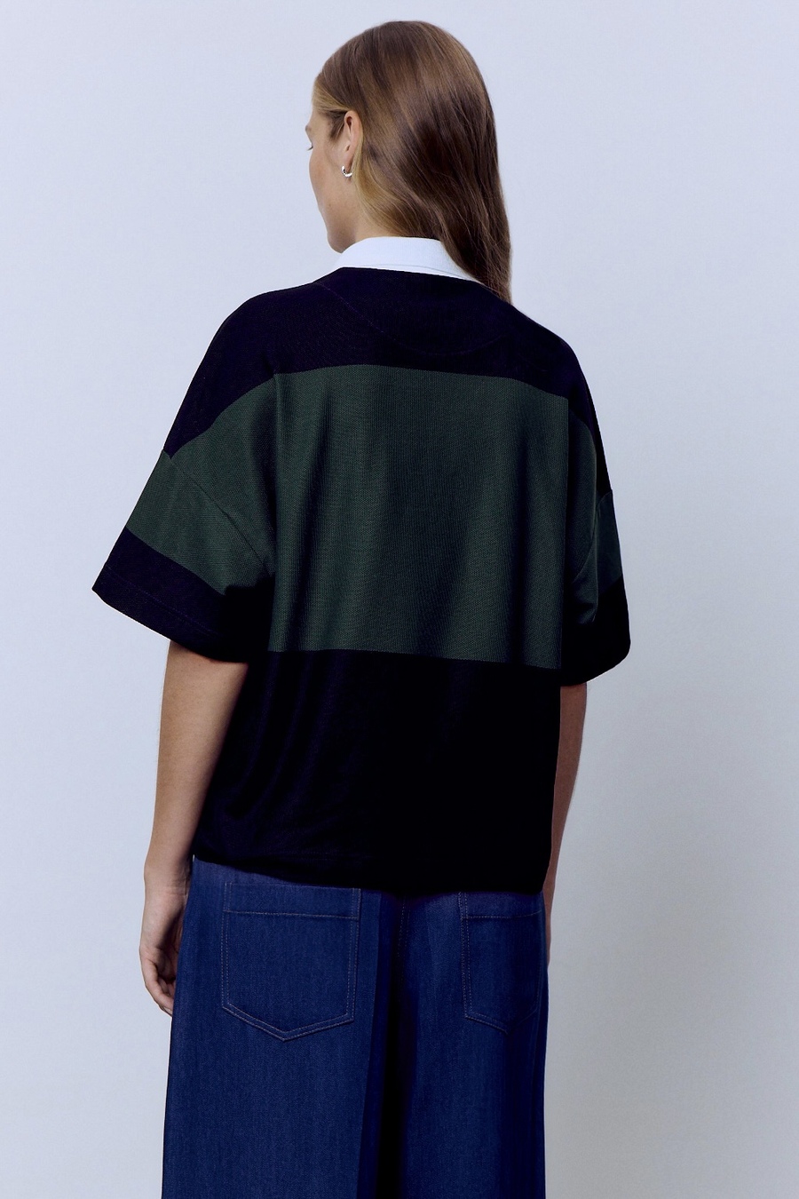 Классика с характером. Поло из фактурного пике в насыщенных оттенках чёрного и зелёного — как свежий акцент в урбанистичном пейзаже. Контрастный белый воротник добавляет дерзкой чёткости и делает образ собранным, но не скучным.