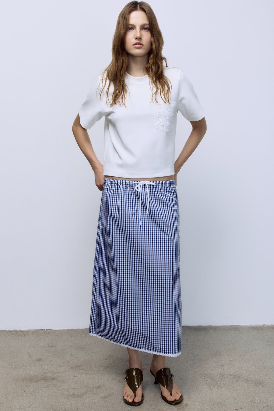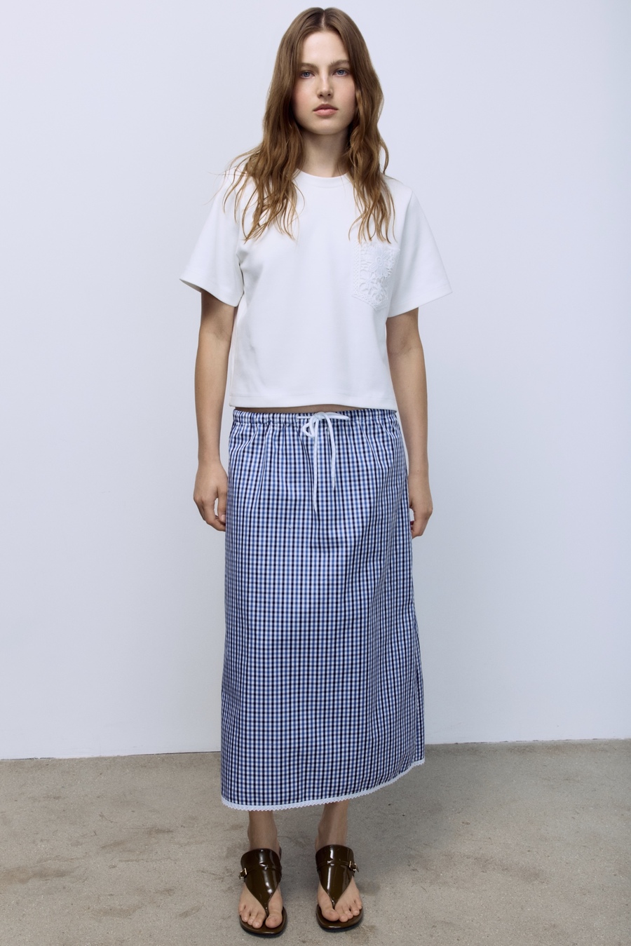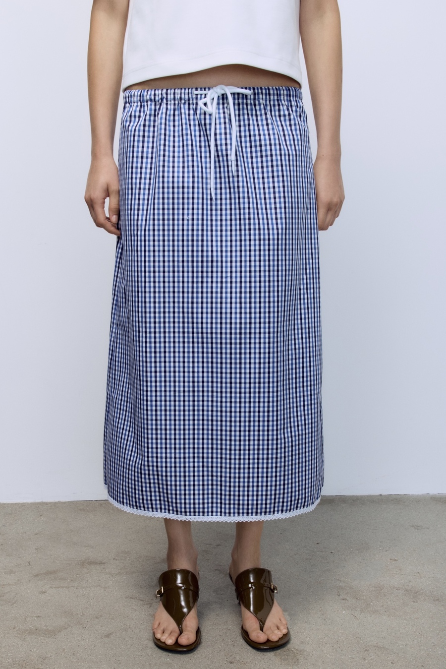 Юбка прямая в клетку виши с кружевом, синий