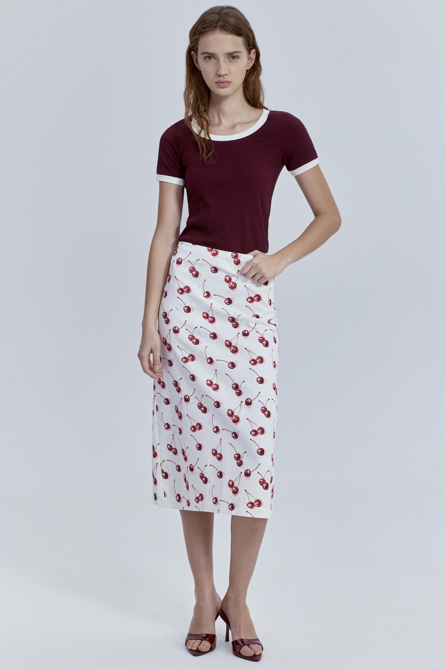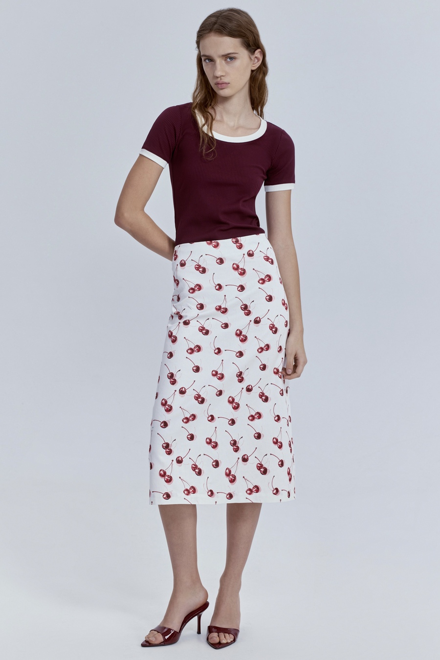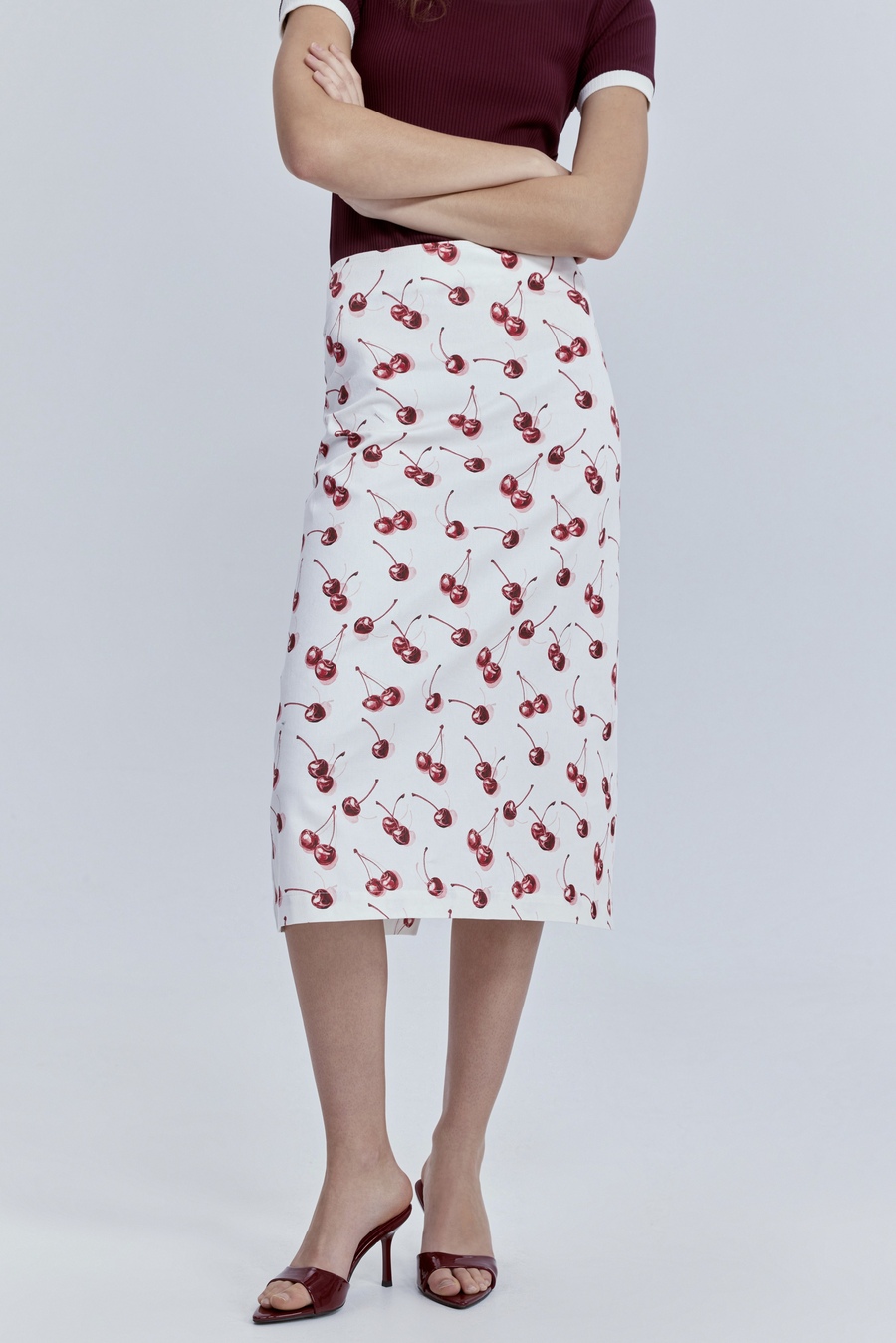 Юбка прямая из лёгкого денима с принтом «вишни», молочный