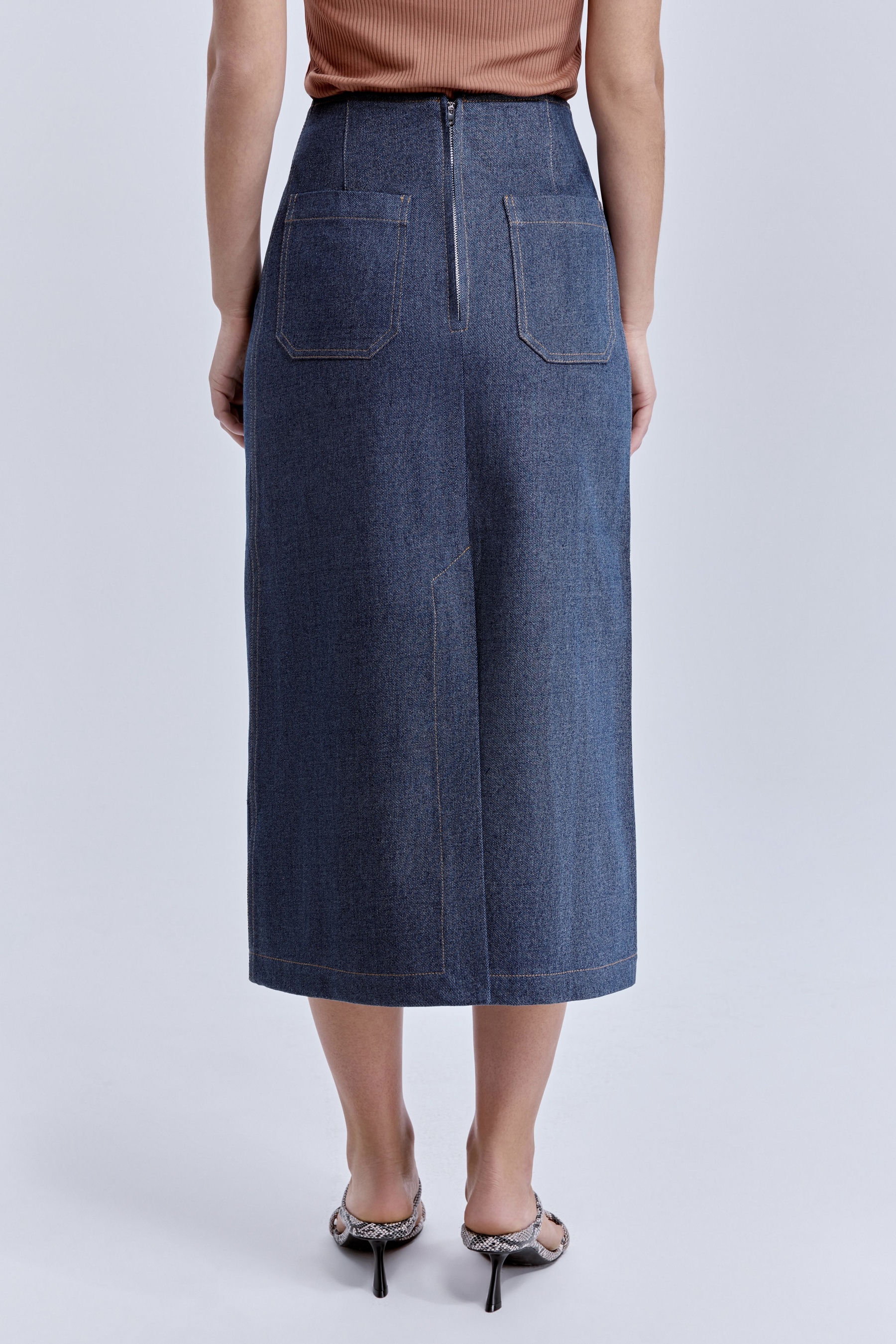 Винтажный деним с характерной фактурой и лёгким эффектом времени задаёт настроение расслабленной аутентичности. Прямой силуэт сохраняет чистоту линий и подчёркивает уверенную простоту формы. Эта юбка выглядит так, будто у неё уже есть история, и именно поэтому она так органично вписывается в современный гардероб.