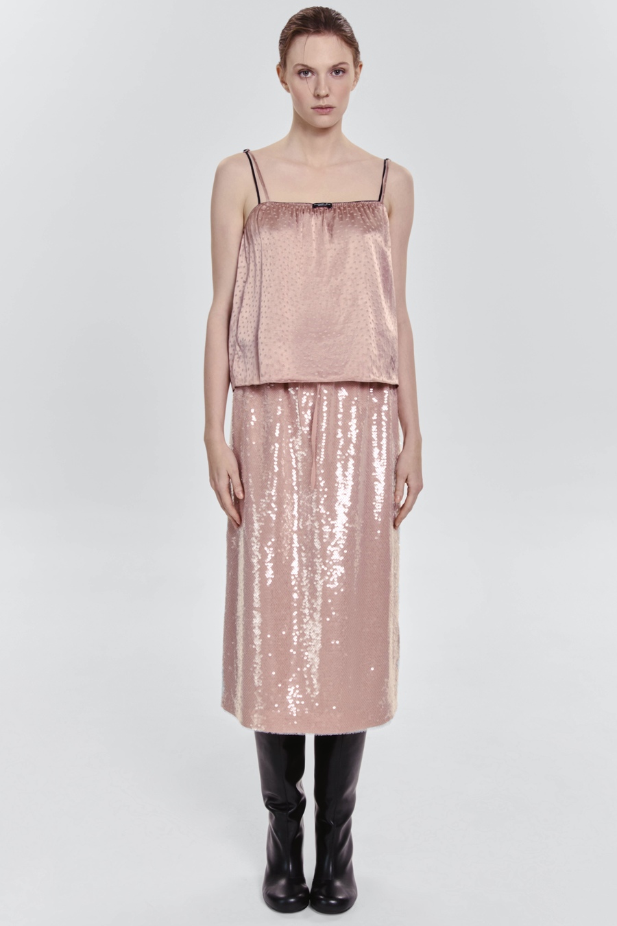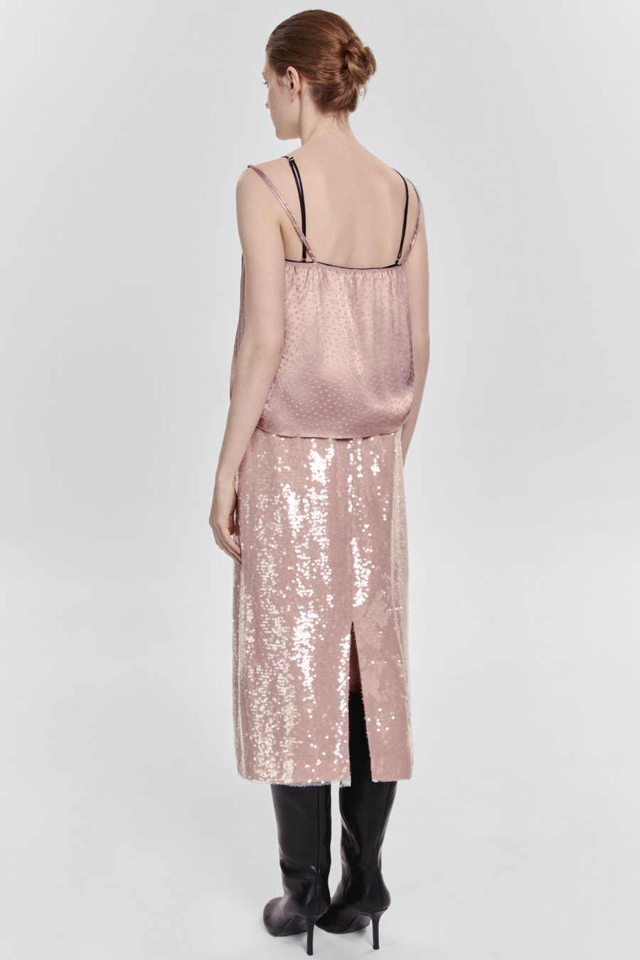 Юбка, созданная сиять в ритме города. Прямая модель из воздушного шифона, усыпанная мерцающими пайетками, ловит каждый отблеск света и делает шаги легче, а образ — выразительнее. Она будто дышит ночной энергией мегаполиса: утончённая, дерзкая и одновременно невесомая.