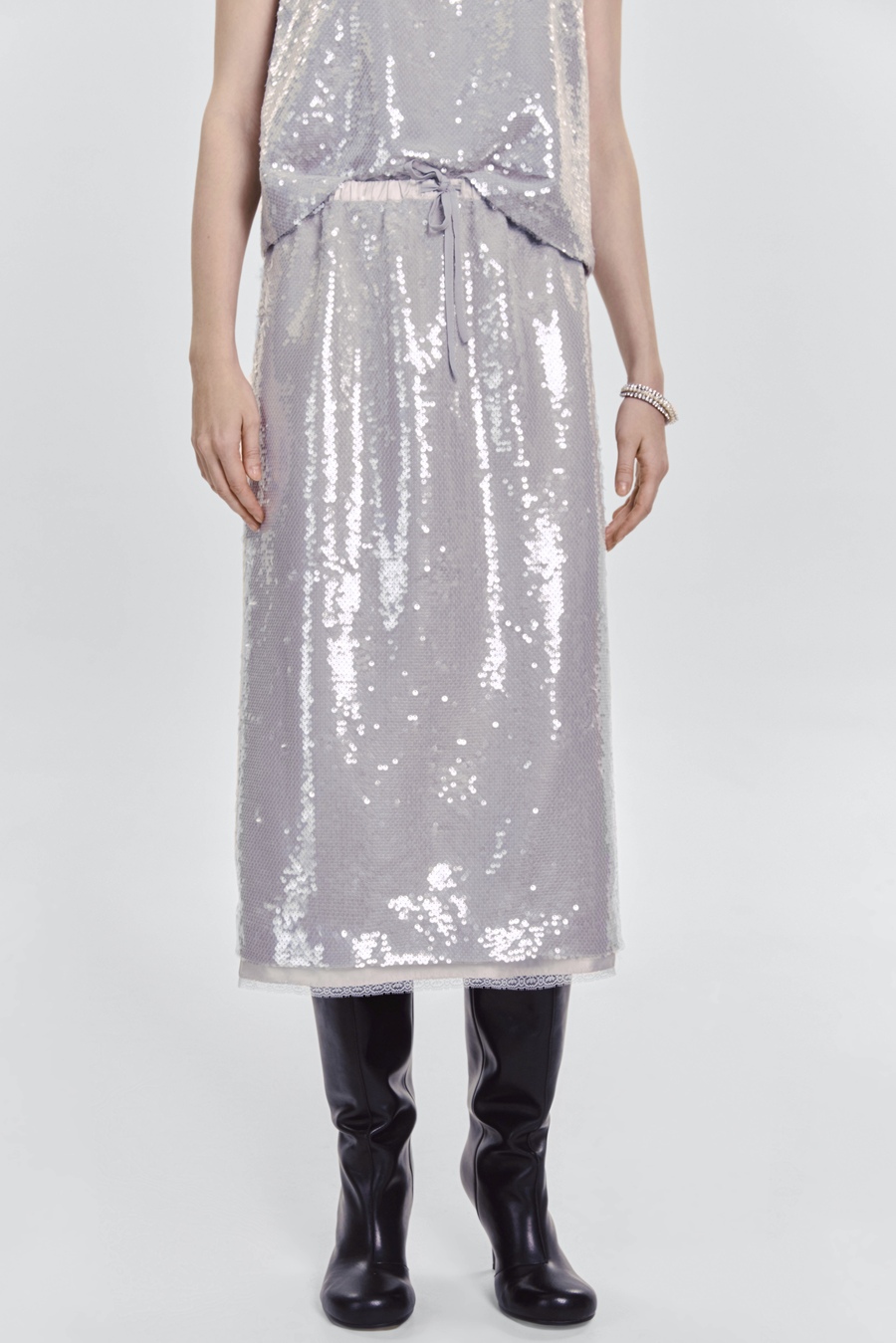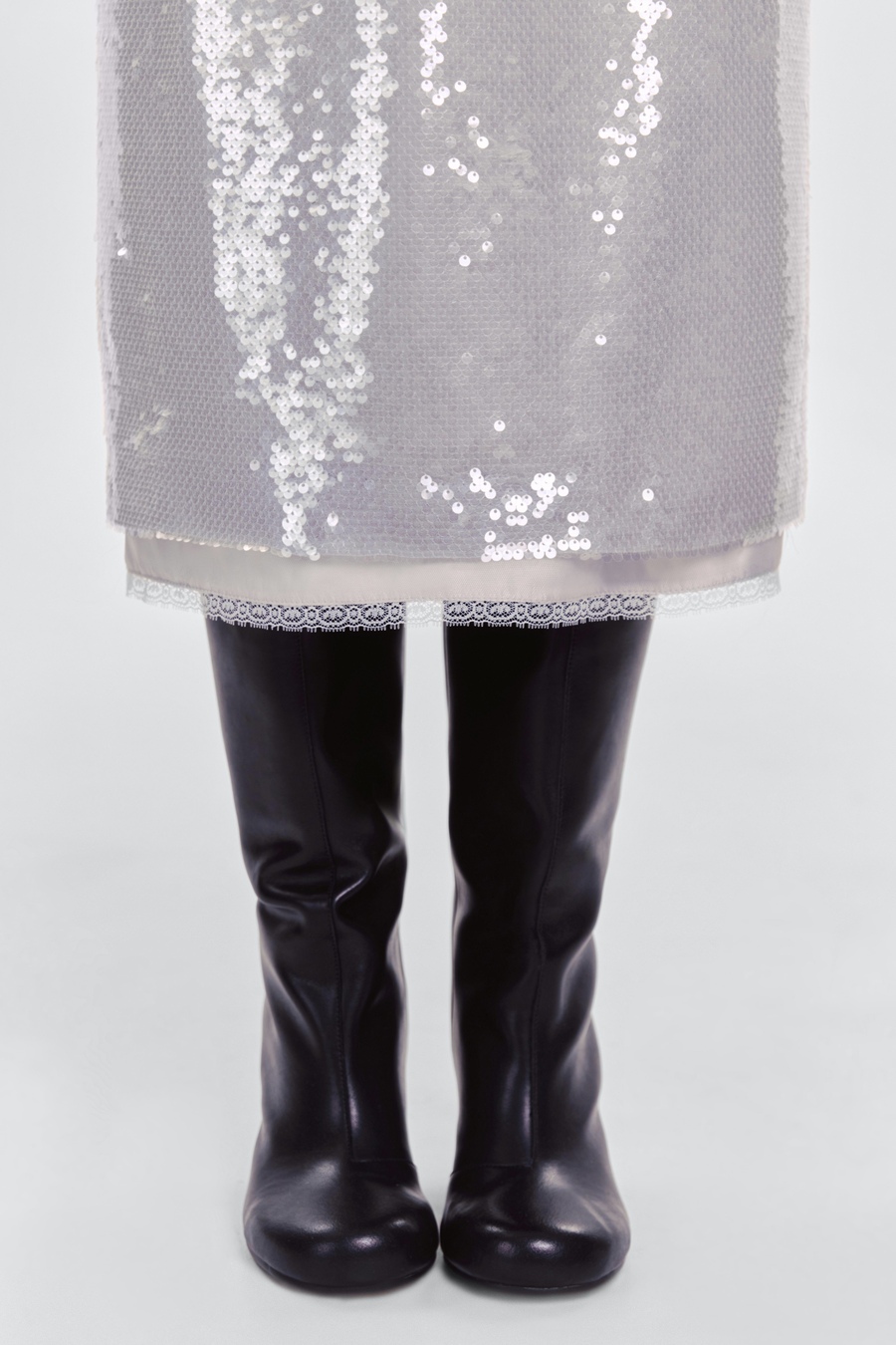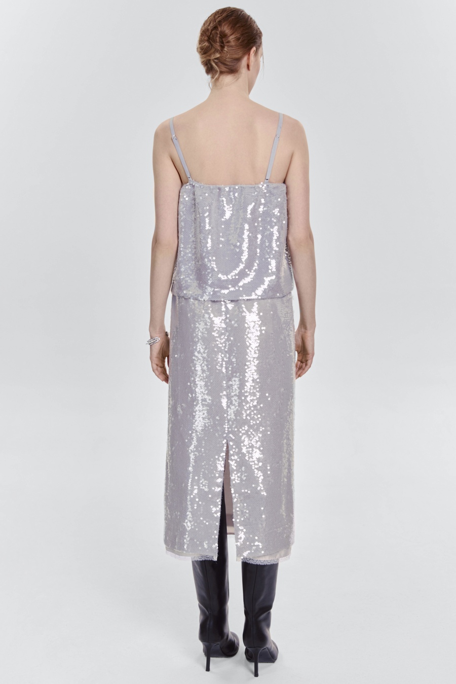 Юбка, созданная сиять в ритме города. Прямая модель из воздушного шифона, усыпанная мерцающими пайетками, ловит каждый отблеск света и делает шаги легче, а образ — выразительнее. Она будто дышит ночной энергией мегаполиса: утончённая, дерзкая и одновременно невесомая.