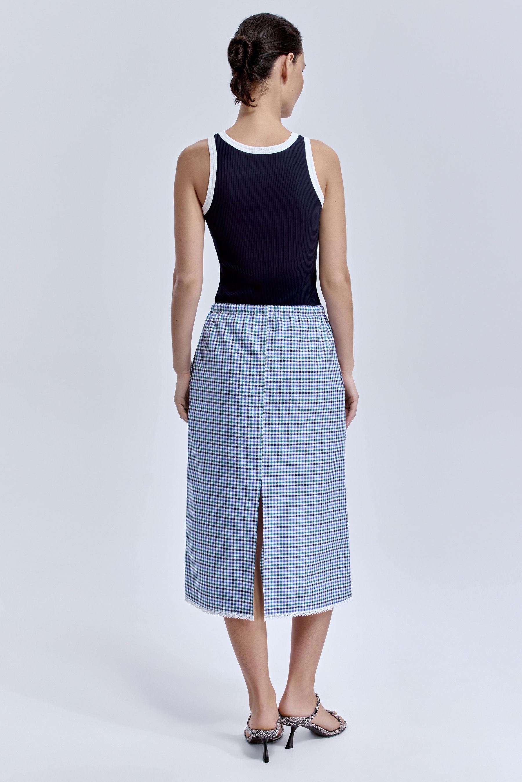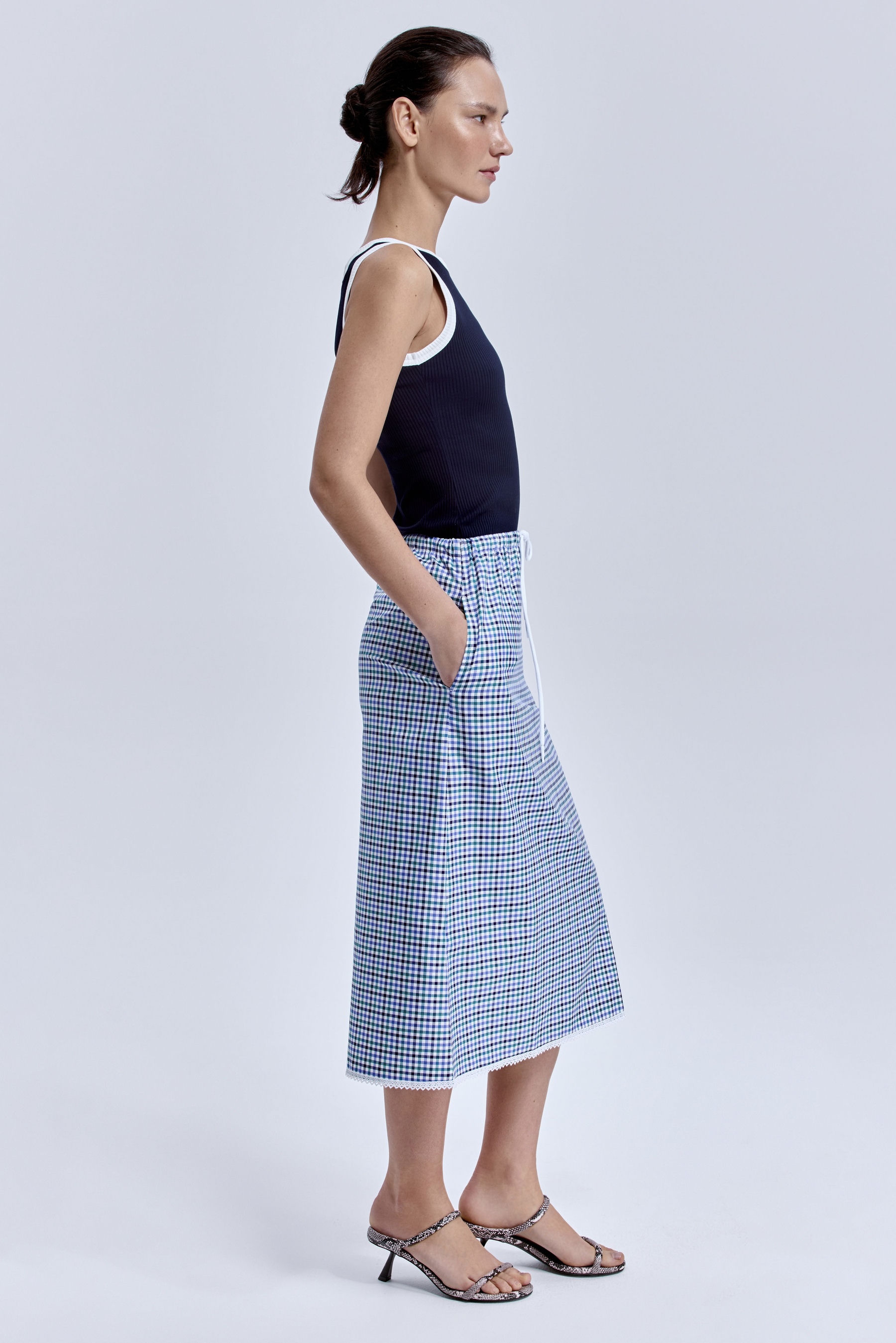 Прямой силуэт держит форму и ритм, а разноцветная клетка добавляет глубины — как город, который никогда не бывает однозначным.