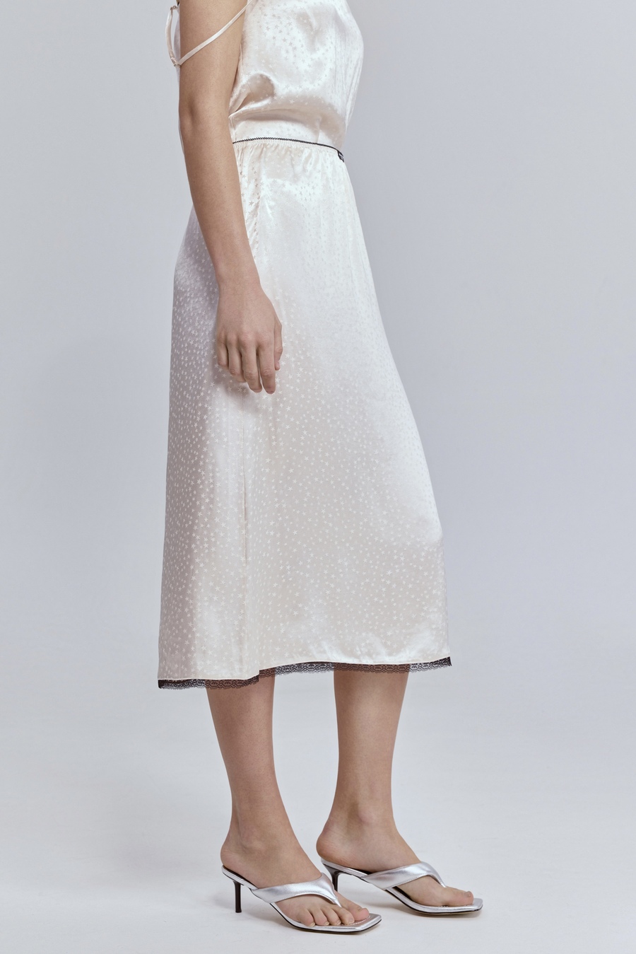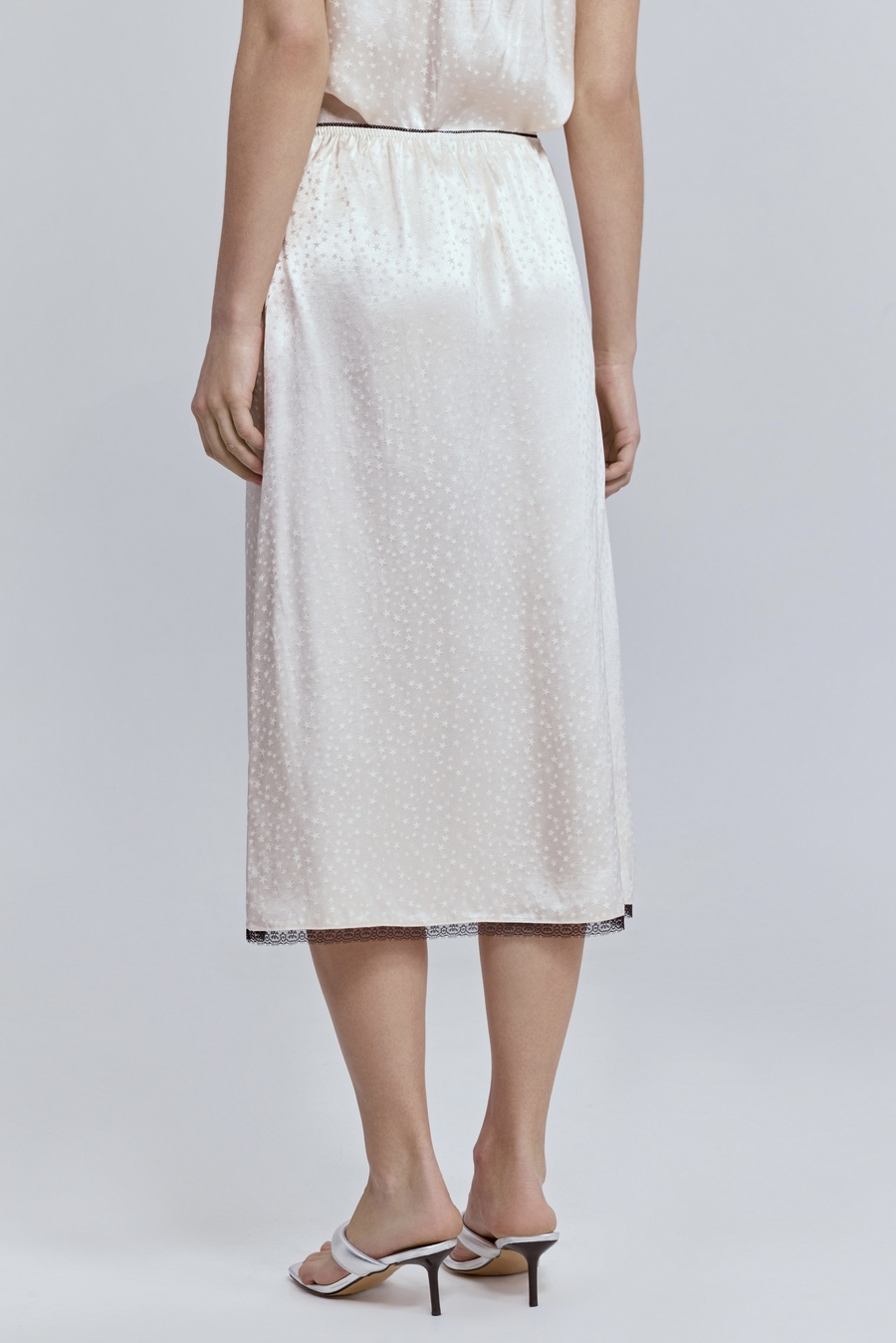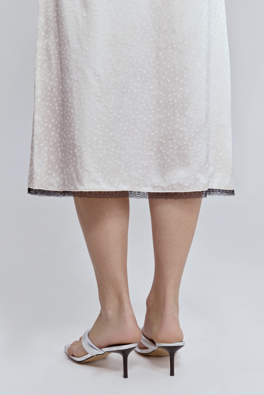 Атласная юбка с кружевом — тот самый акцент, который делает образ запоминающимся. Гладкая, текучая фактура мягко отражает свет и красиво движется при каждом шаге, а изящное кружево по низу добавляет образу нотку чувственности и утончённой дерзости.