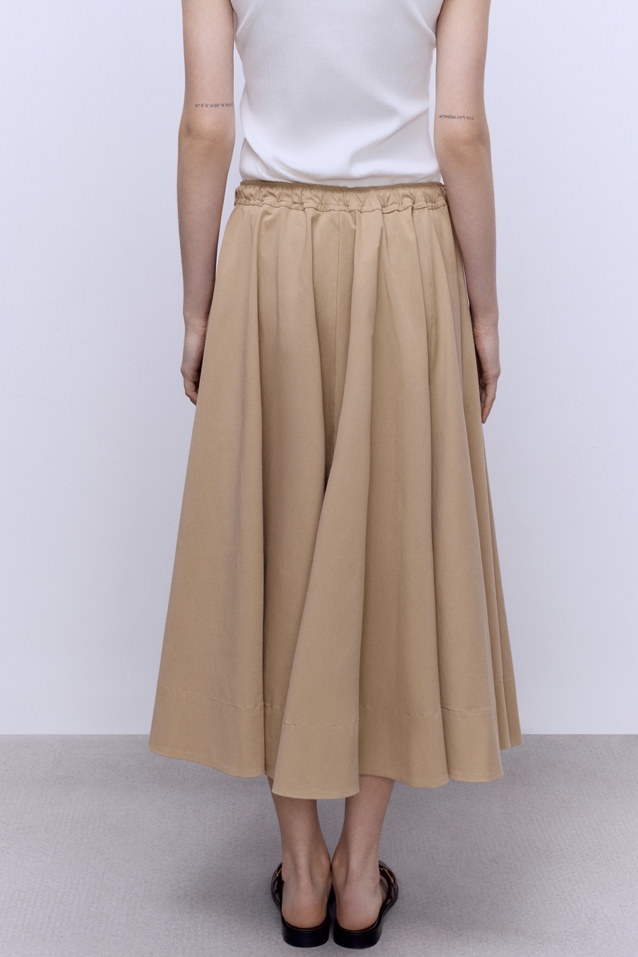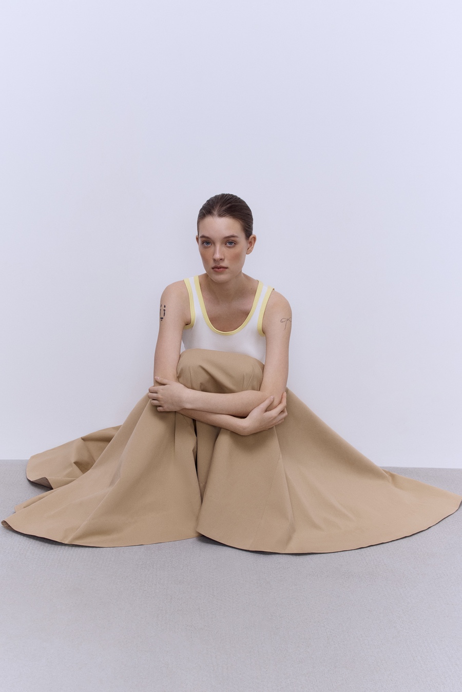 Юбка-солнце из весенней коллекции — легкая, но структурированная, она держит форму, создавая эффектный силуэт. Натуральный хлопковый габардин дышит и приятно ощущается на коже, а контрастная обтачка добавляет выразительности образу. Бежевый оттенок — универсальная база для смелых сочетаний или сдержанной элегантности. Будьте уверены: эта юбка будет собирать комплименты, куда бы вы ни отправились.